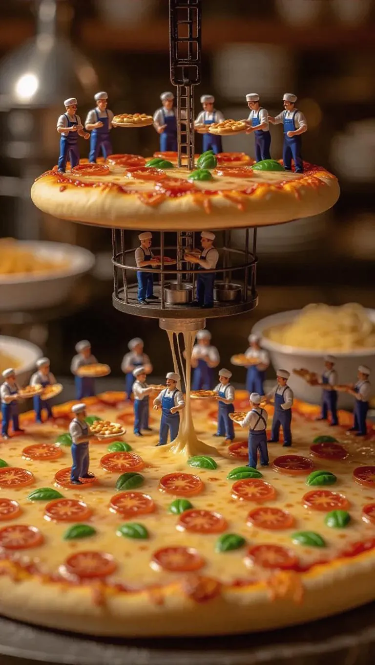 A lively pizza factory where a colossal pizza is crafted by thumb-sized workers. A miniature lift hoists a fresh dough base, while tiny chefs add toppings with tiny utensils. Some workers assemble the pizza like a mosaic, while others bake it in small ovens. The smell of melted cheese fills the air, while the blurred background showcases an Italian restaurant with pasta dishes.