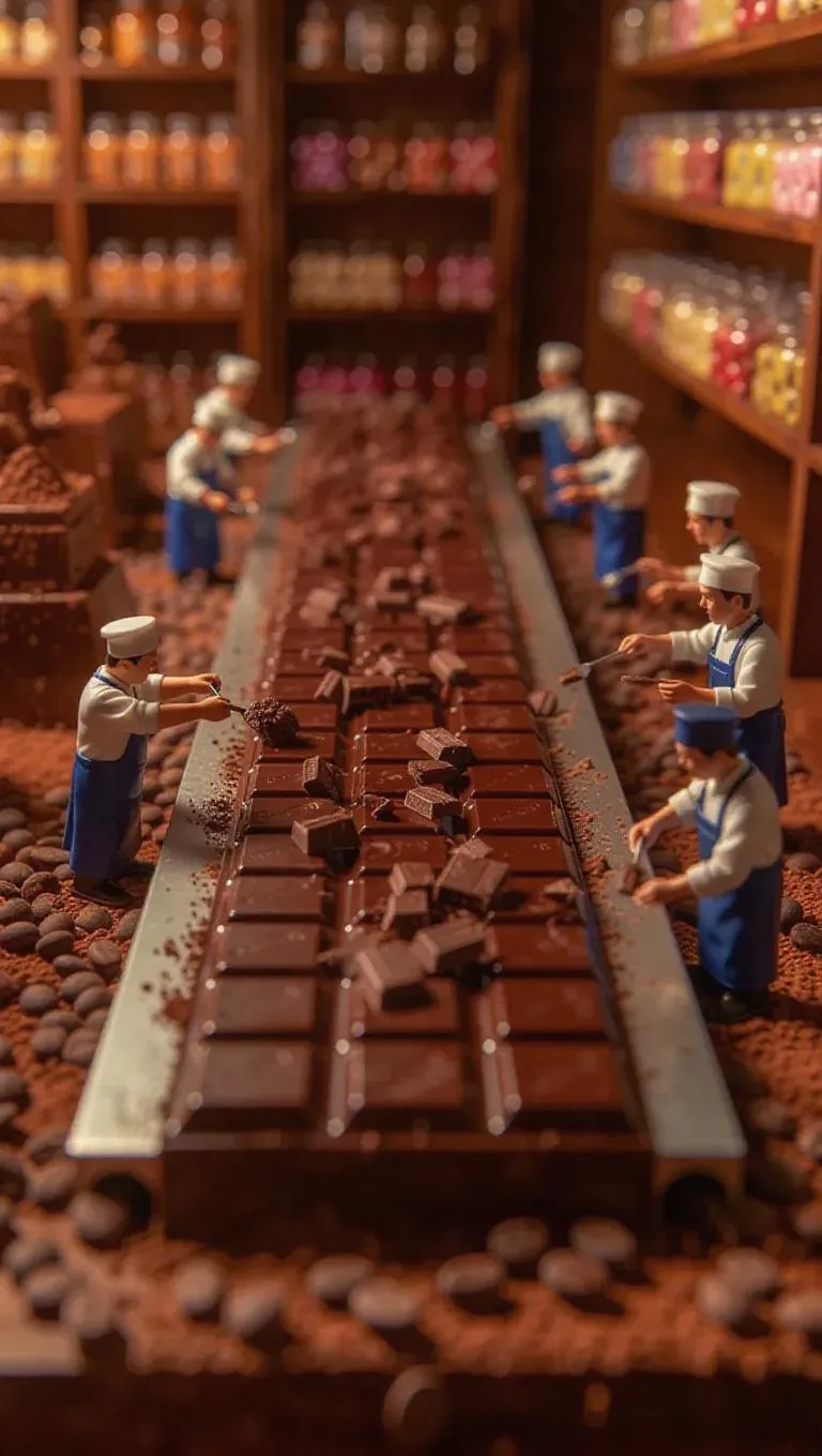 An enchanting chocolate workshop where a gigantic chocolate bar is being formed by thumb-sized chocolatiers. A miniature conveyor belt transports cocoa beans, while tiny artisans temper the chocolate with small tools. Some chocolatiers shape the bar into unique designs, while others package it. Rich chocolate scents fill the space, while the blurred background shows a quaint sweet shop with candies displayed.