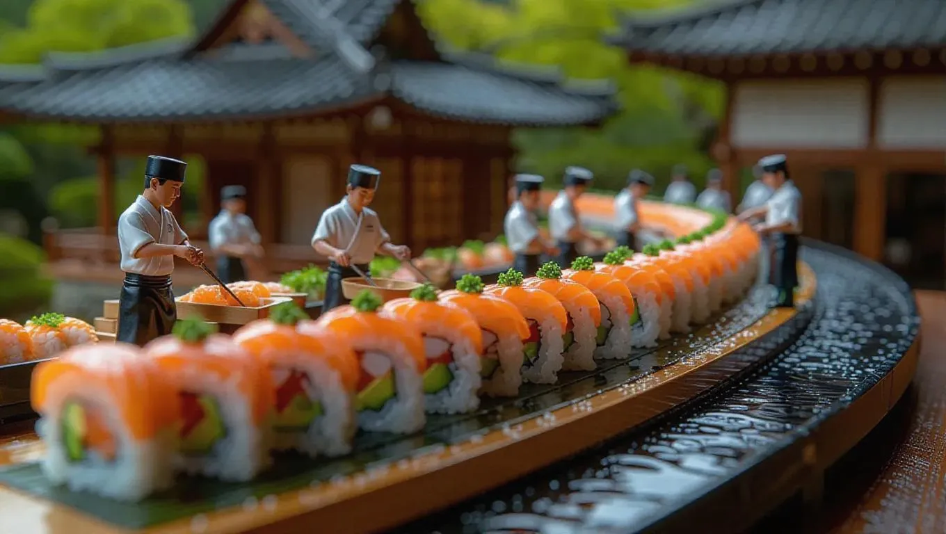 A vibrant sushi restaurant where a colossal sushi platter is being rolled by thumb-sized chefs. A miniature conveyor belt carries seaweed sheets, while tiny artisans spread rice with small utensils. Some workers arrange the sushi pieces like a colorful mosaic, while others slice fish on tiny boards. The aroma of fresh seafood fills the air, as the blurred background features a traditional Japanese tea house.