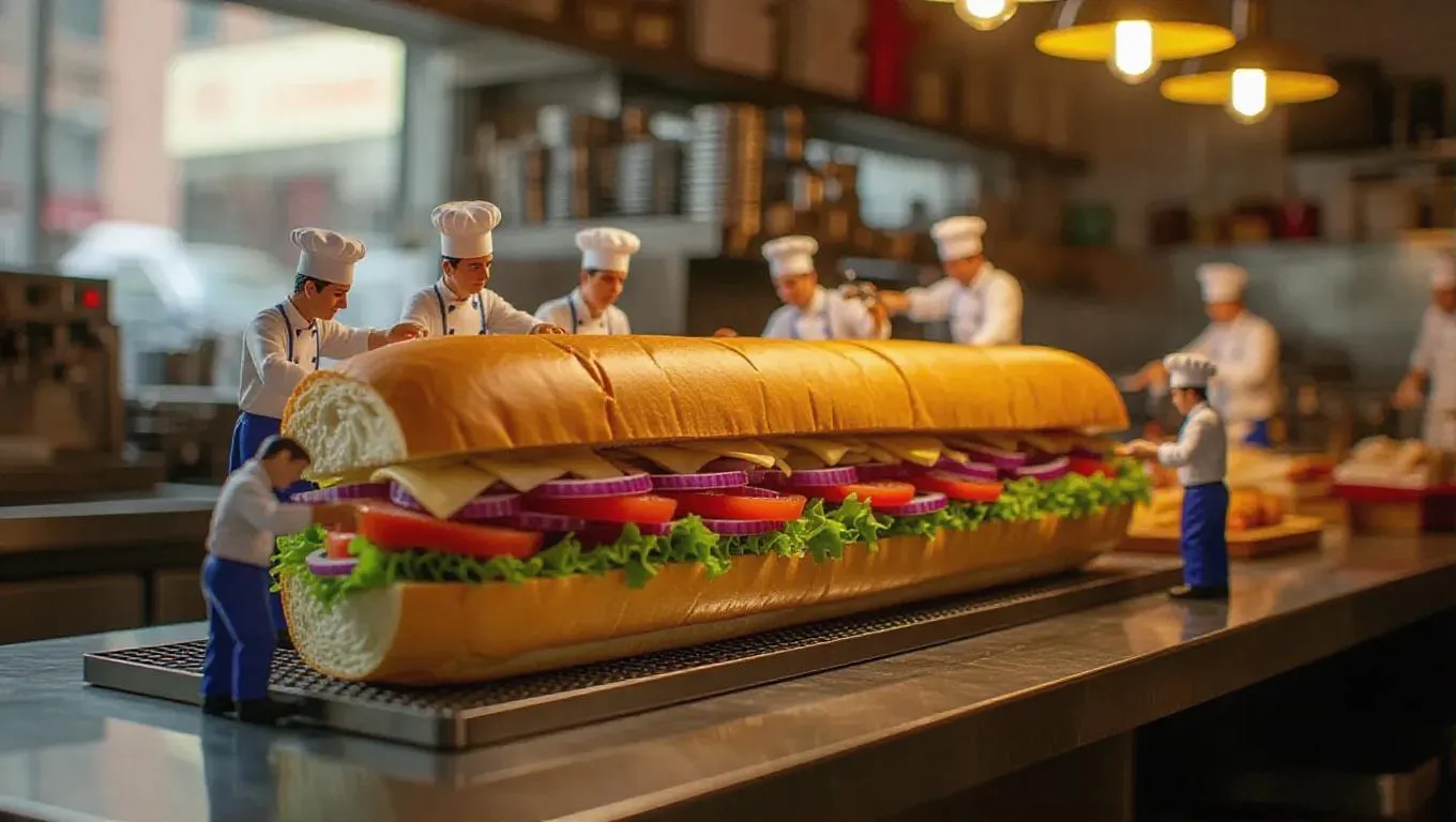 A quirky sandwich shop where a gigantic sub is being assembled by thumb-sized sandwich artists. A mini hoagie roller transports fresh bread, while tiny chefs layer ingredients with small tools. Some workers craft the sandwich with meticulous care, while others toast it in tiny presses. The scent of fresh bread wafts through, with a blurred background showcasing a bustling café scene.