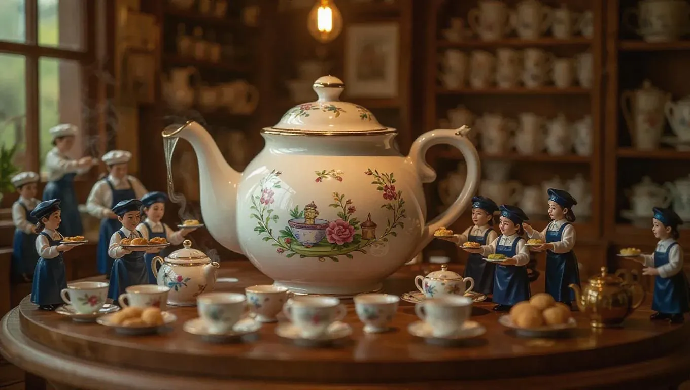 A cheerful tea room where a giant teapot is brewed by thumb-sized tea makers. A miniature kettle pours steamy water, while tiny chefs add loose leaves with small spoons. Some workers arrange tea cups like a display, while others prepare snacks on tiny trays. The calming aroma fills the space, with the blurred background showing a cozy reading nook.