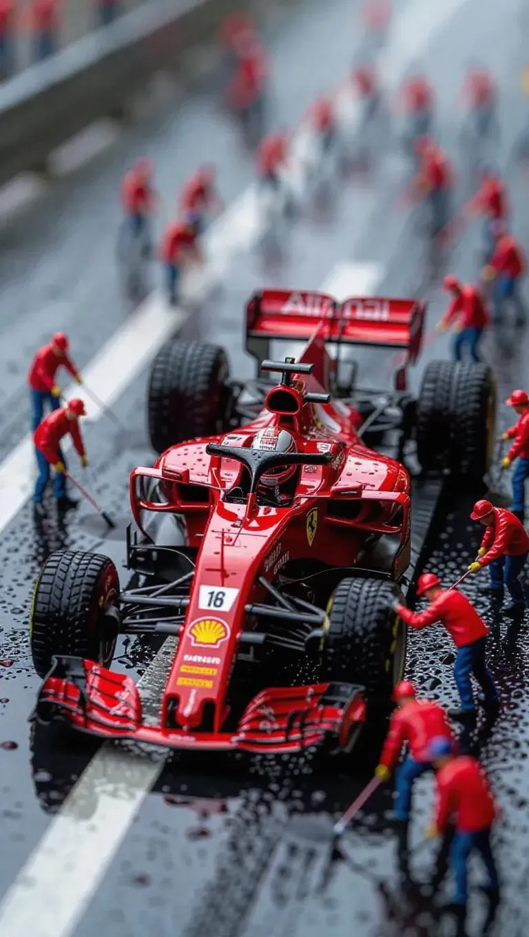 A group of tiny, thumb-sized workers is diligently cleaning a vibrant, red F1 racing car, which is the centerpiece of the image. The car is parked on a wet surface, possibly a highway or parking lot, and has white splatters on its side, indicating that it has been recently washed or sprayed. The miniature workers are scattered around the car, some standing closer to it while others are further away. They appear to be focused on their task, using tiny brushes and hoses to scrub and rinse the vehicle. The surrounding environment is dominated by a gray, overcast sky, which casts a soft, diffusive light over the scene. There are no other objects or people visible in the image, and no text or distinctive markings are present.