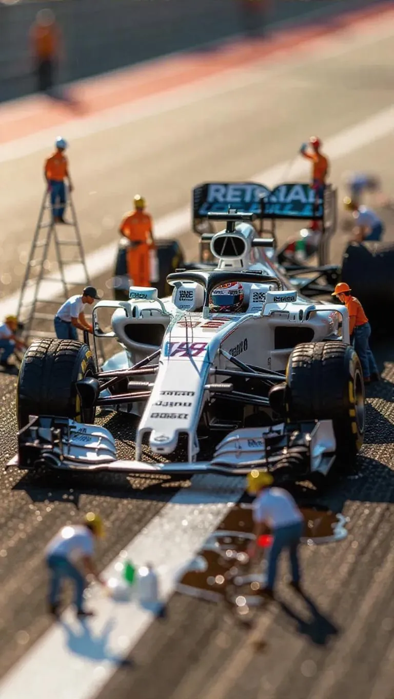 A group of tiny, thumb-sized workers is busily wiping down a beautiful, white F1 racing car, which serves as the focal point of the image. The car is parked on an asphalt surface, possibly a racetrack or speedway, and has black splatters on its side, indicating it has been recently driven. The miniature workers are arranged around the car, some using ladders while others kneel on the ground. They appear to be hard at work, using tiny towels and sprayers to clean and detail the vehicle. The surrounding environment features a bright, sunny day that illuminates the scene with clarity and warmth. There are no other objects or people visible in the image, and no text or distinctive markings are present.