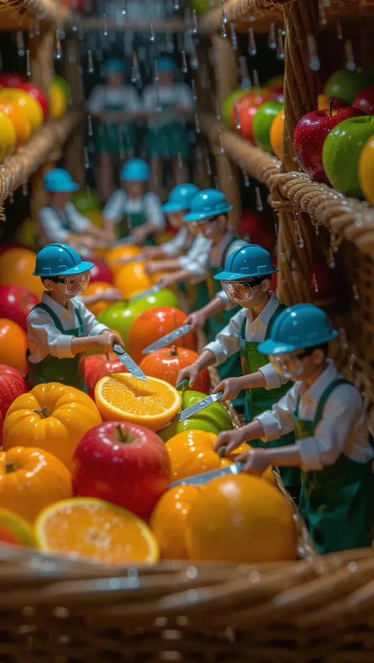 A group of tiny workers in safety goggles and aprons is busy inside a large fruit basket. Some are peeling the fruits with tiny knives, while others are arranging them on a miniature assembly line, while juice drips like rain. The whole scene resembles a vibrant fruit market, with shelves and ropes inside the basket.