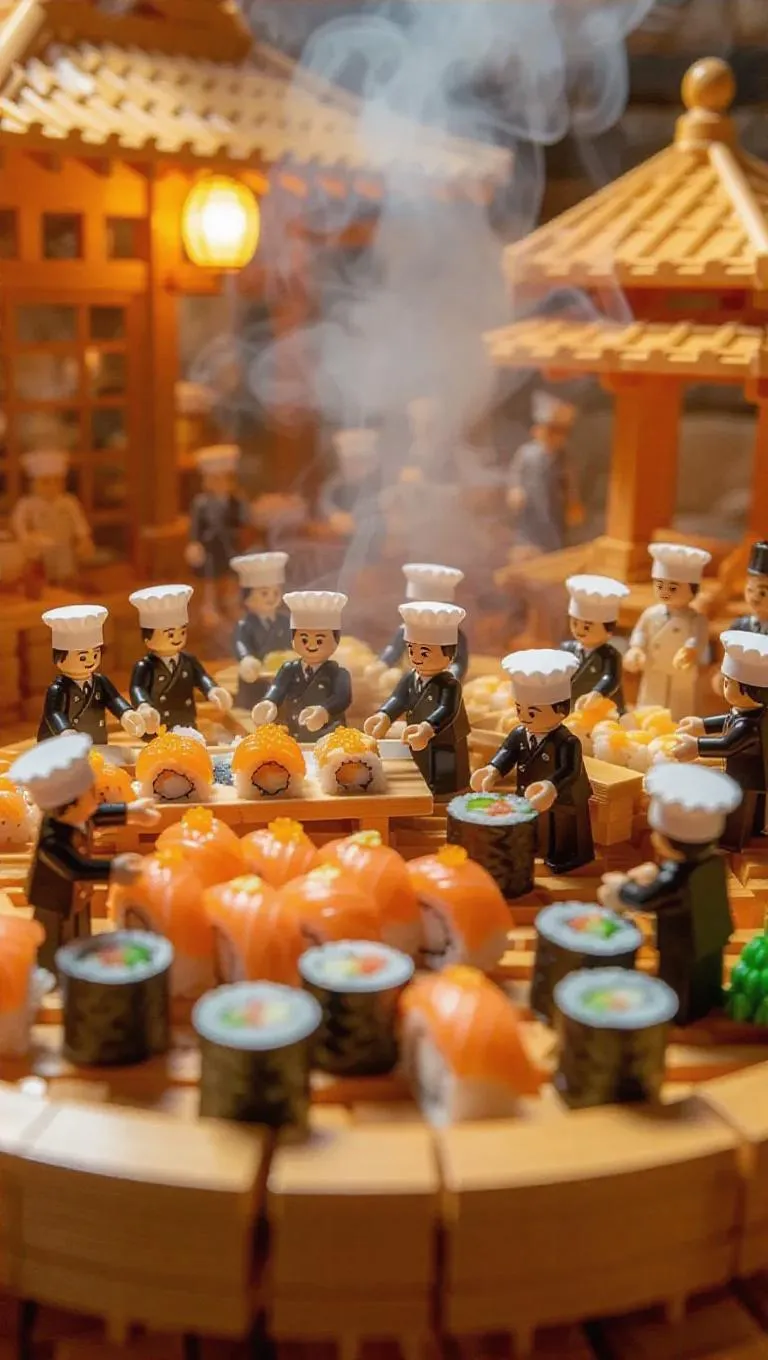A team of thumb-sized chefs in chef hats and aprons is preparing sushi inside a giant sushi plate. Some are rolling the sushi with giant mats, while others are adding sauces on a miniature conveyor belt, while steam swirls around. The whole scene resembles an elaborate sushi restaurant, with tables and decorations inside the plate.