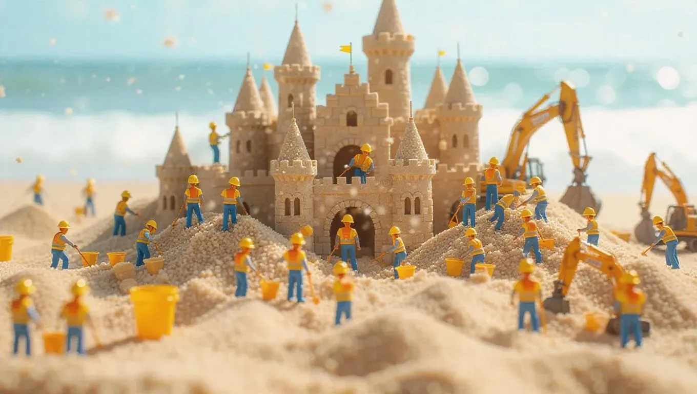 A band of miniature construction workers in yellow helmets and vests is operating inside a colossal sandcastle. Some are digging with tiny shovels, while others are sculpting towers on a small scale, while grains of sand drift like snowflakes. The whole scene looks like a busy seaside construction site, with buckets and tools scattered around.