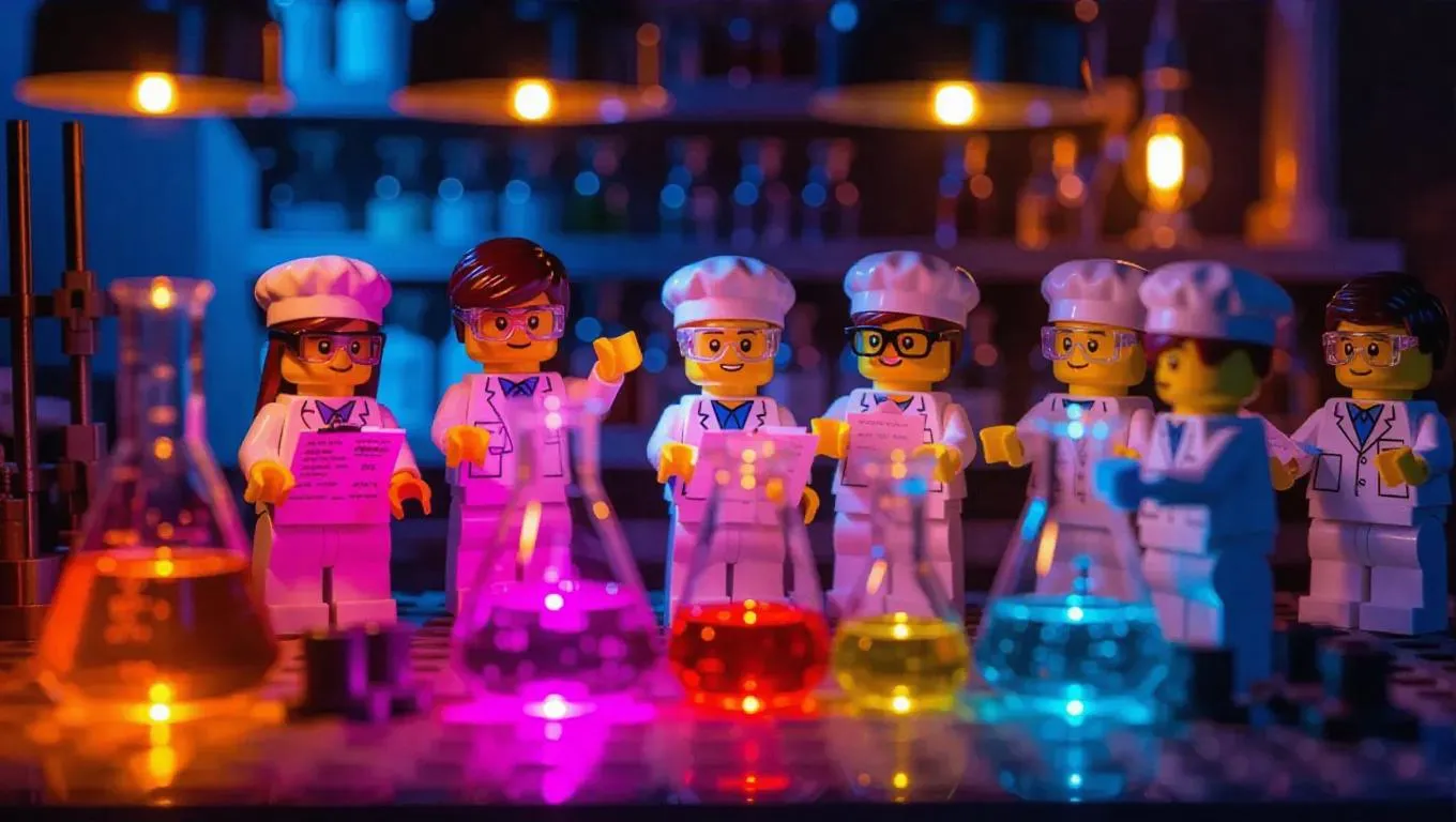 A troop of thumb-sized researchers in lab coats and goggles is conducting experiments inside a large science lab. Some are mixing chemicals in oversized test tubes, while others are taking notes on a tiny clipboard, while colorful reactions fizz and bubble. The whole scene resembles an exciting scientific discovery, with equipment and diagrams everywhere.