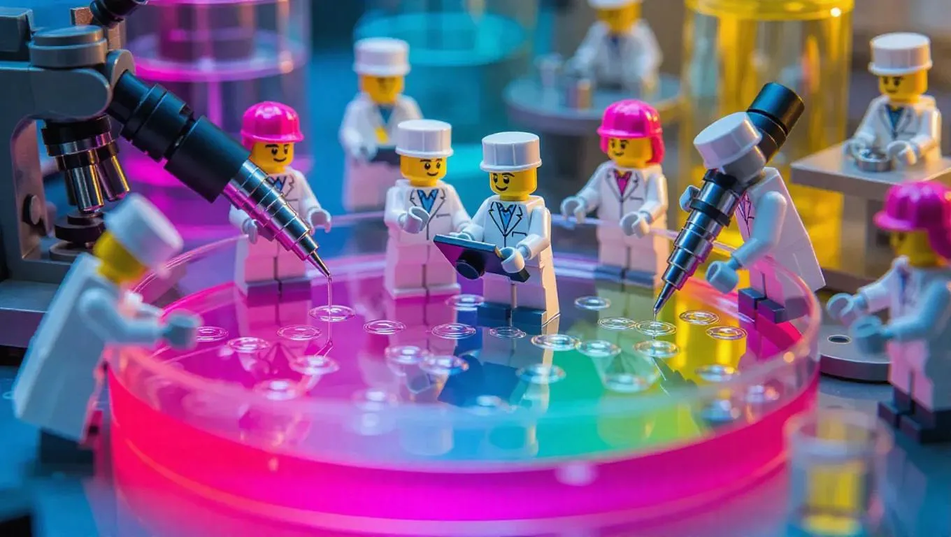 A crew of miniature scientists in lab coats and goggles is working inside a large petri dish. Some are examining specimens with oversized microscopes, while others are annotating findings on a tiny pad, while samples bubble like hot springs. The whole scene looks like a lively laboratory, with equipment and supplies everywhere.