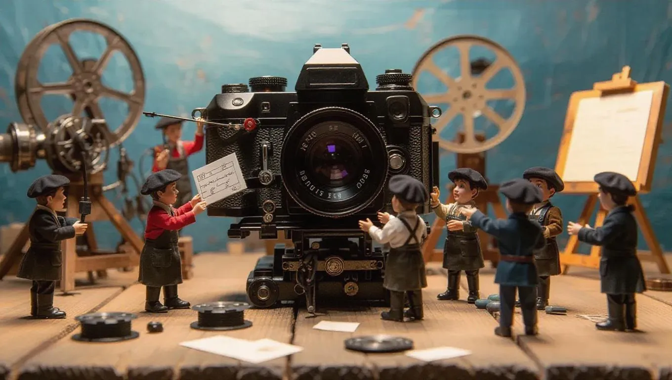 A team of tiny filmmakers in berets and aprons is shooting a film inside a giant camera. Some are adjusting the lens with oversized tools, while others are framing shots on a tiny monitor, while film reels spin like whirlwinds. The whole scene looks like an exciting film studio, with scripts and gear everywhere.