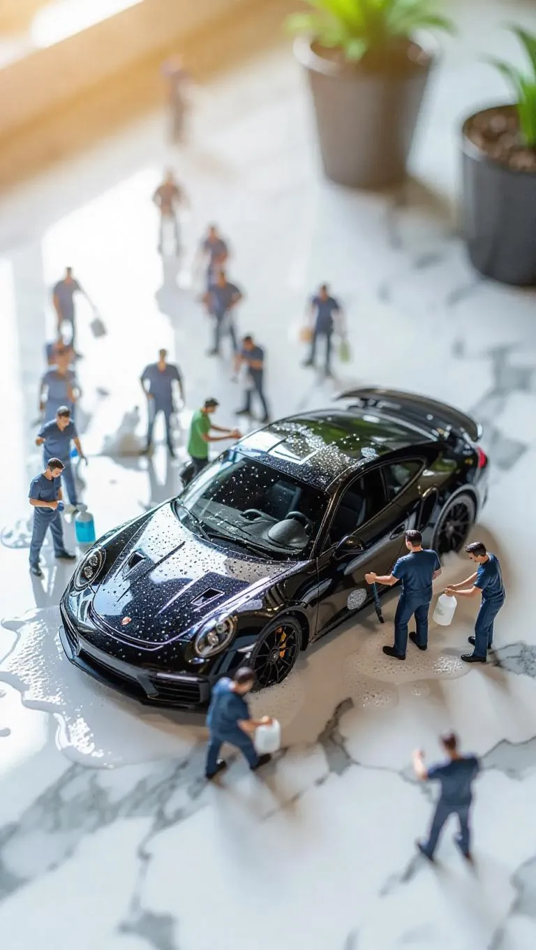 A group of tiny, thumb-sized workers is diligently cleaning a matte black sports car, which is the centerpiece of the image. The car is parked on a marbled surface, possibly an elegant showroom, and has white splatters on its side, indicating that it has been recently washed or sprayed. The miniature workers are scattered around the car, some standing closer to it while others are further away. They appear to be focused on their task, using tiny cloths and spray bottles to scrub and rinse the vehicle. The surrounding environment is dominated by a bright, sunny sky, which casts an optimistic light over the scene. There are no other objects or people visible in the image, and no text or distinctive markings are present.
