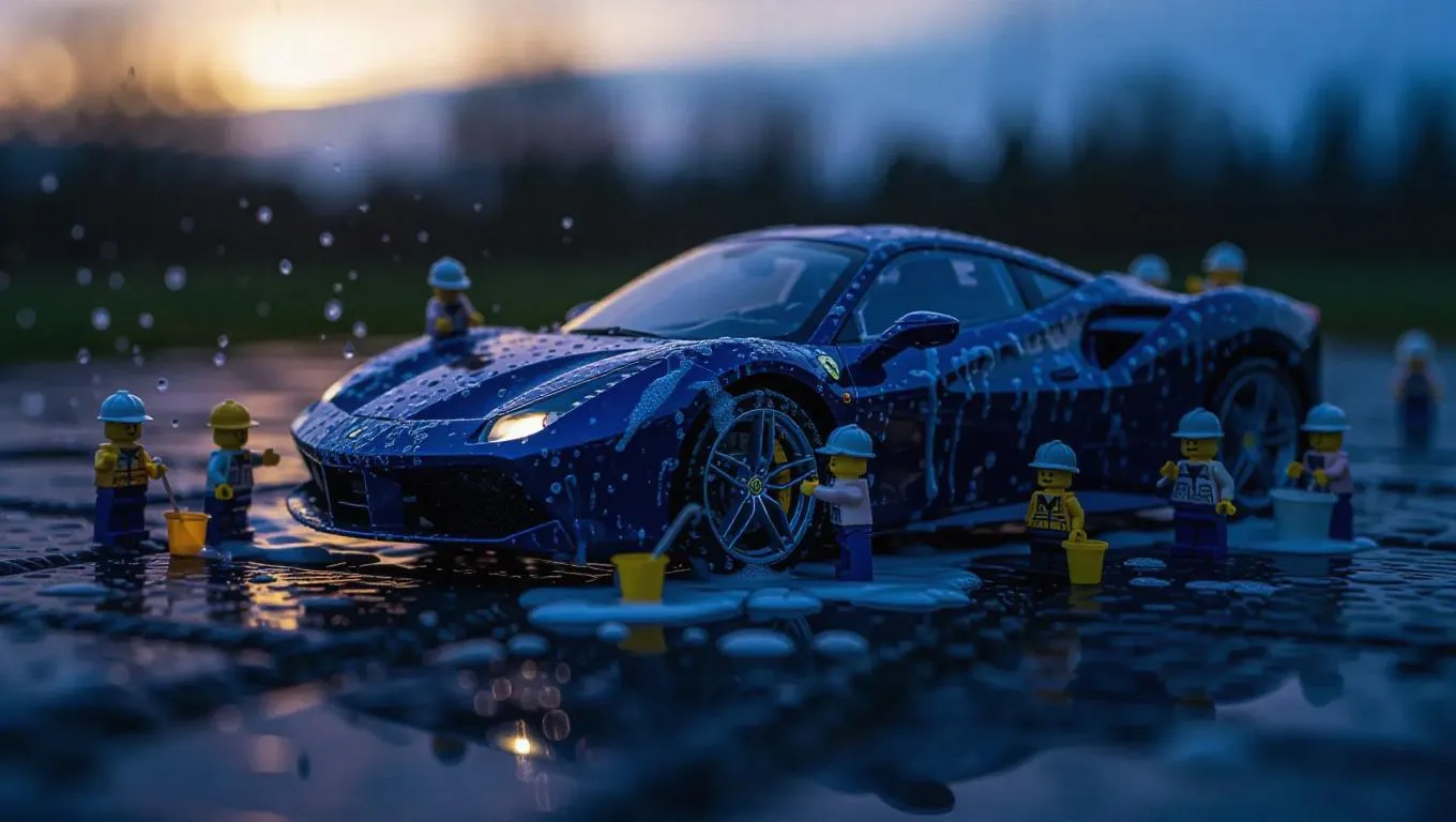 A group of tiny, thumb-sized workers is diligently cleaning a sophisticated, navy blue sports car, which is the centerpiece of the image. The car is parked on a stone pathway, and has white splatters on its side, indicating that it has been recently washed or sprayed. The miniature workers are scattered around the car, some standing closer to it while others are further away. They appear to be focused on their task, using tiny suds and buckets to scrub and rinse the vehicle. The surrounding environment is dominated by a twilight sky, which casts a calm light over the scene. There are no other objects or people visible in the image, and no text or distinctive markings are present.
