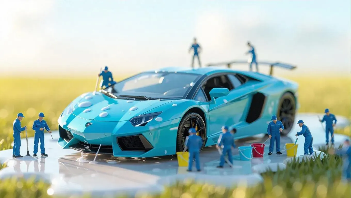 A group of tiny, thumb-sized workers is diligently cleaning a gorgeous, electric blue sports car, which is the centerpiece of the image. The car is parked on a grass-covered surface, and has white splatters on its side, indicating that it has been recently washed or sprayed. The miniature workers are scattered around the car, some standing closer to it while others are further away. They appear to be focused on their task, using tiny mops and buckets to scrub and rinse the vehicle. The surrounding environment is dominated by a soft, pastel sky, which casts an inviting light over the scene. There are no other objects or people visible in the image, and no text or distinctive markings are present.
