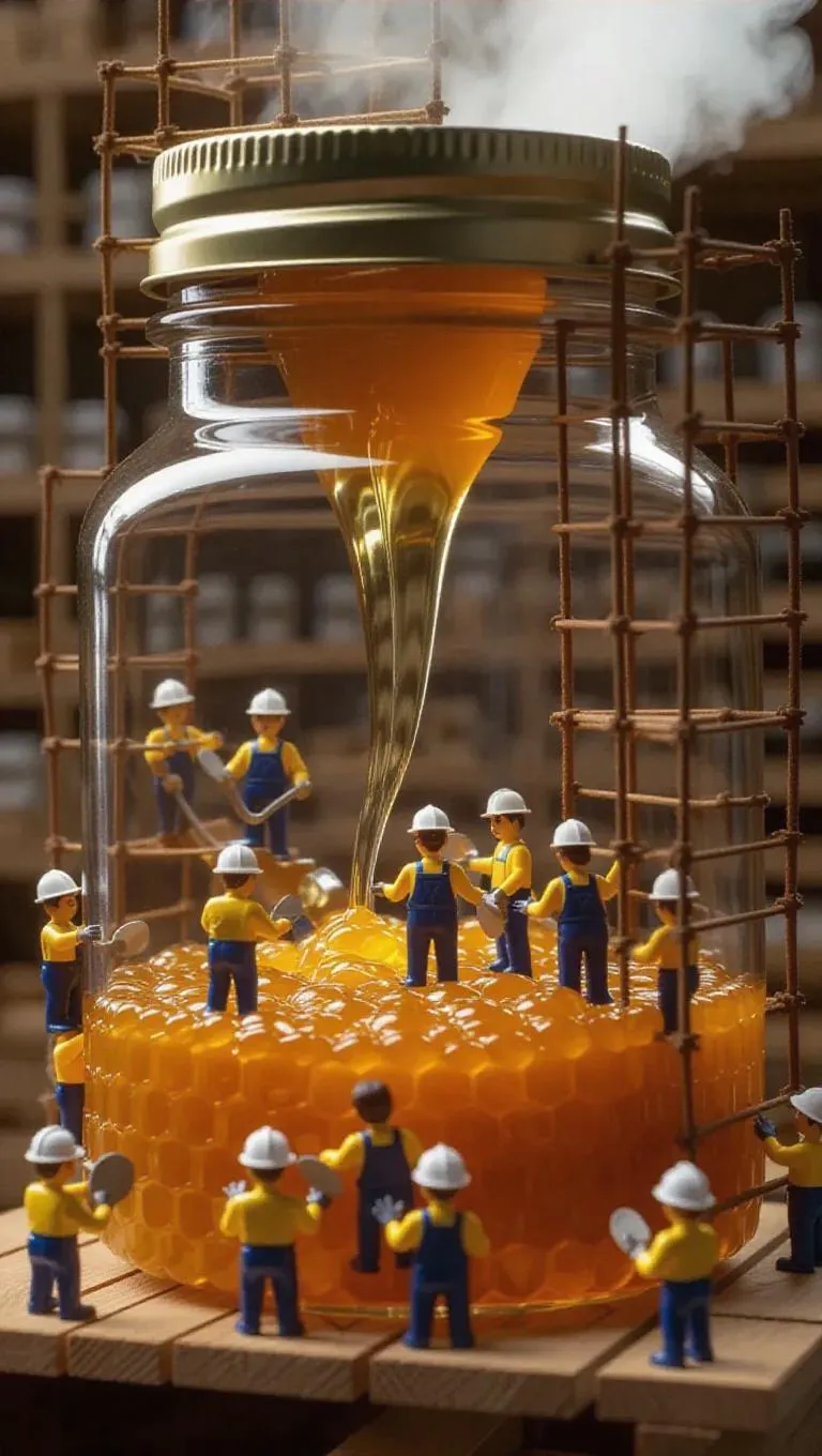 A team of thumb-sized workers in safety helmets and aprons is working inside a massive honey jar. Some are stirring the honey with giant paddles, others are extracting nectar on a miniature conveyor belt, while steam rises like factory smoke. The whole scene looks like a bustling honey factory, with scaffolding and ladders inside the jar.