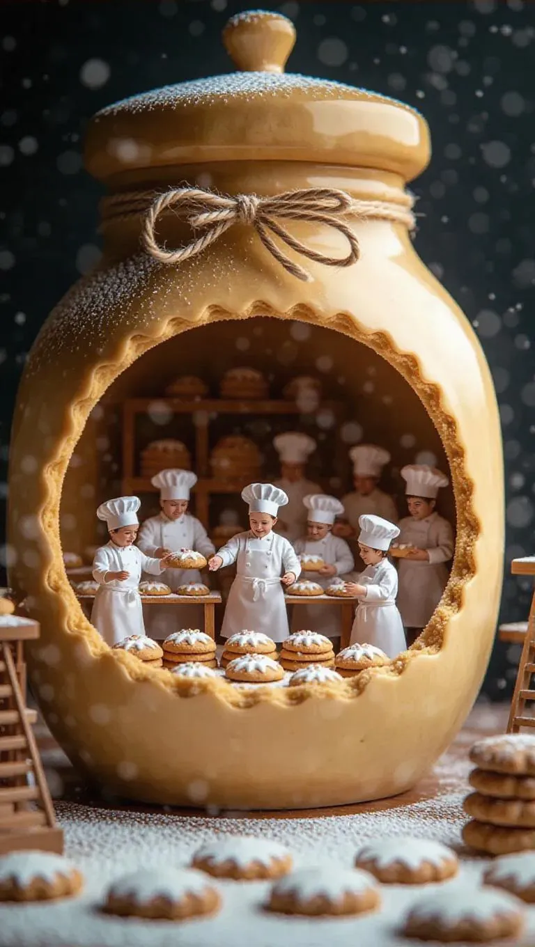 A group of small bakers in chef hats and coats is working inside an oversized cookie jar. Some are rolling dough using giant pins, others are decorating cookies on a tiny conveyor belt, while flour dust floats like baker’s snow. The whole scene resembles a bustling bakery, with racks and ladders inside the jar.