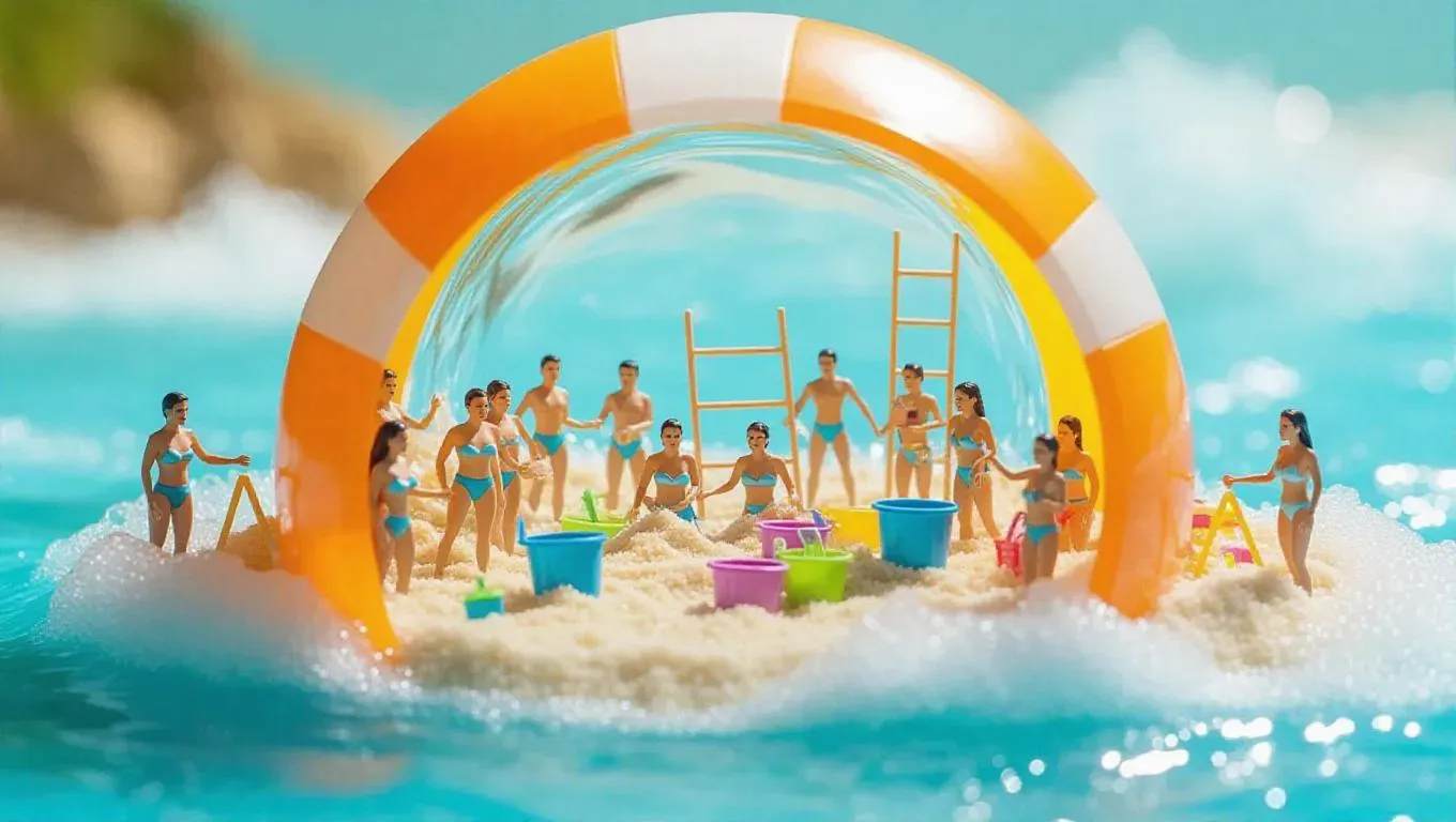 A team of miniature lifeguards in swimsuits is supervising inside a giant beach ball jar. Some are building sandcastles with large buckets, others are splashing water on a tiny shore, while waves ripple like playful ghosts. The entire scene appears to be a fun beach party, with towels and ladders inside the jar.