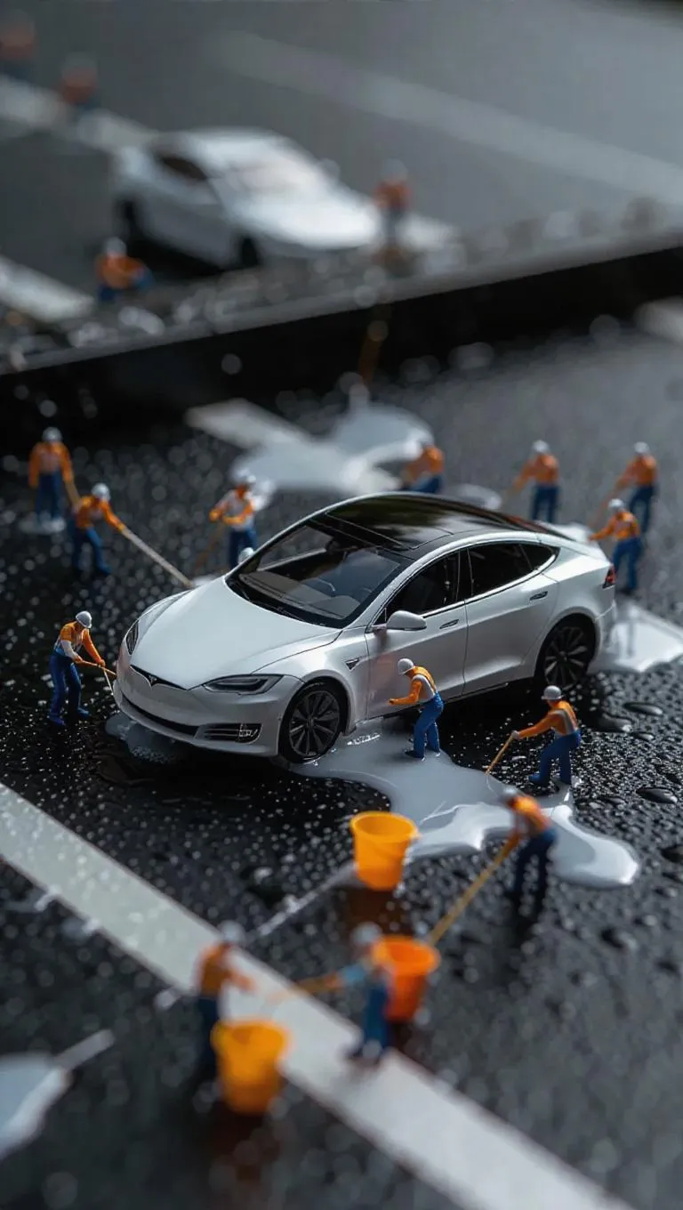 A group of tiny, thumb-sized workers is diligently cleaning a sleek, white electric car, which is the centerpiece of the image. The car is parked on a wet surface, possibly a highway or parking lot, and has white splatters on its side, indicating that it has been recently washed or sprayed. The miniature workers are scattered around the car, some standing closer to it while others are further away. They appear to be focused on their task, using tiny sponges and buckets to scrub and rinse the vehicle. The surrounding environment is dominated by a gray, overcast sky, which casts a soft, diffused light over the scene. There are no other objects or people visible in the image, and no text or distinctive markings are present.