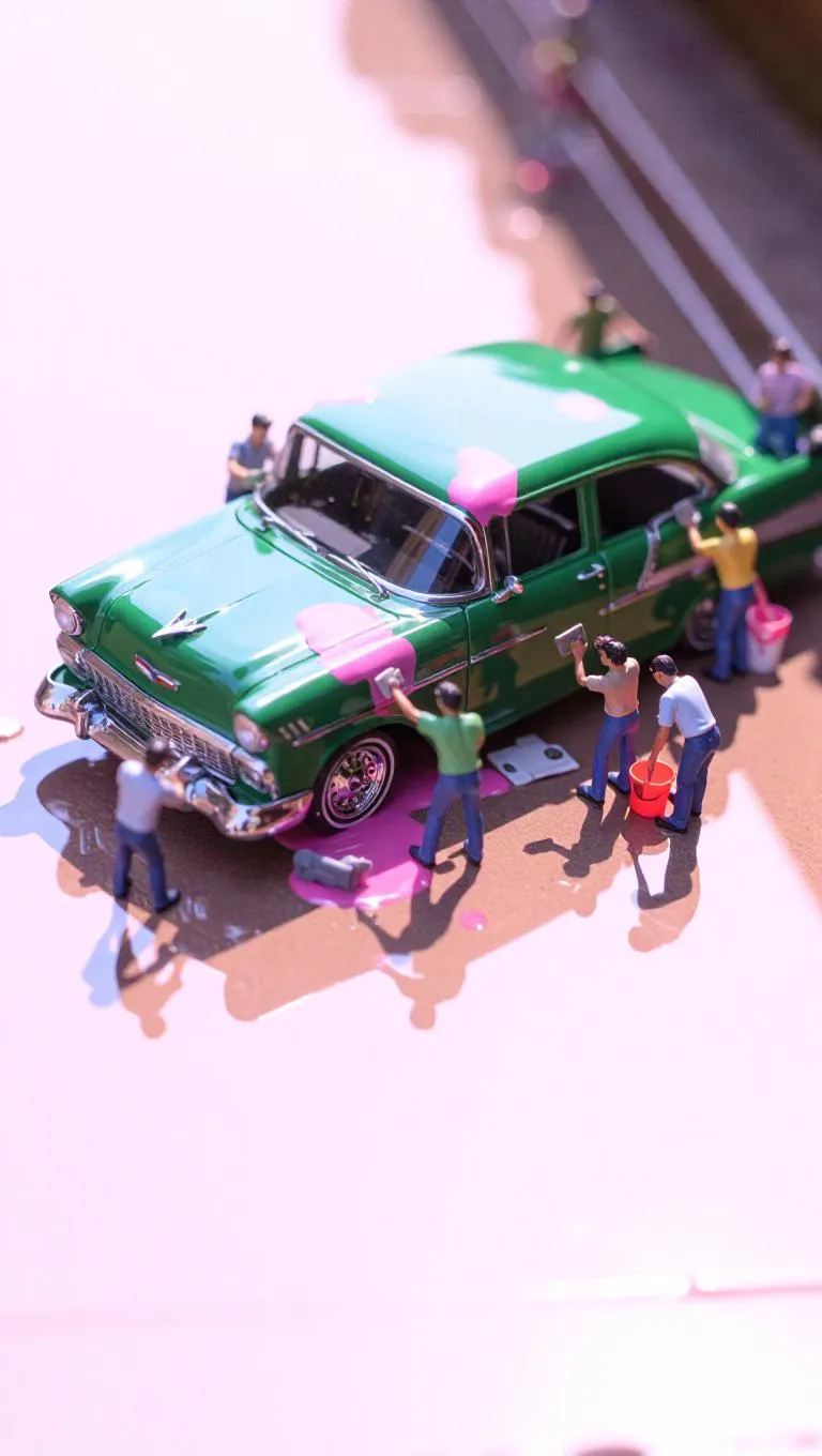 A group of tiny, thumb-sized workers is diligently cleaning a classic green car, which is the centerpiece of the image. The car is parked on a wet surface, possibly an alley or residential street, and has pink splatters on its side, indicating that it has been recently washed or sprayed. The miniature workers are scattered around the car, some standing closer to it while others are further away. They appear to be focused on their task, using tiny cloths and buckets to scrub and rinse the vehicle. The surrounding environment is dominated by a twilight sky, which casts a dim, warm light over the scene. There are no other objects or people visible in the image, and no text or distinctive markings are present.