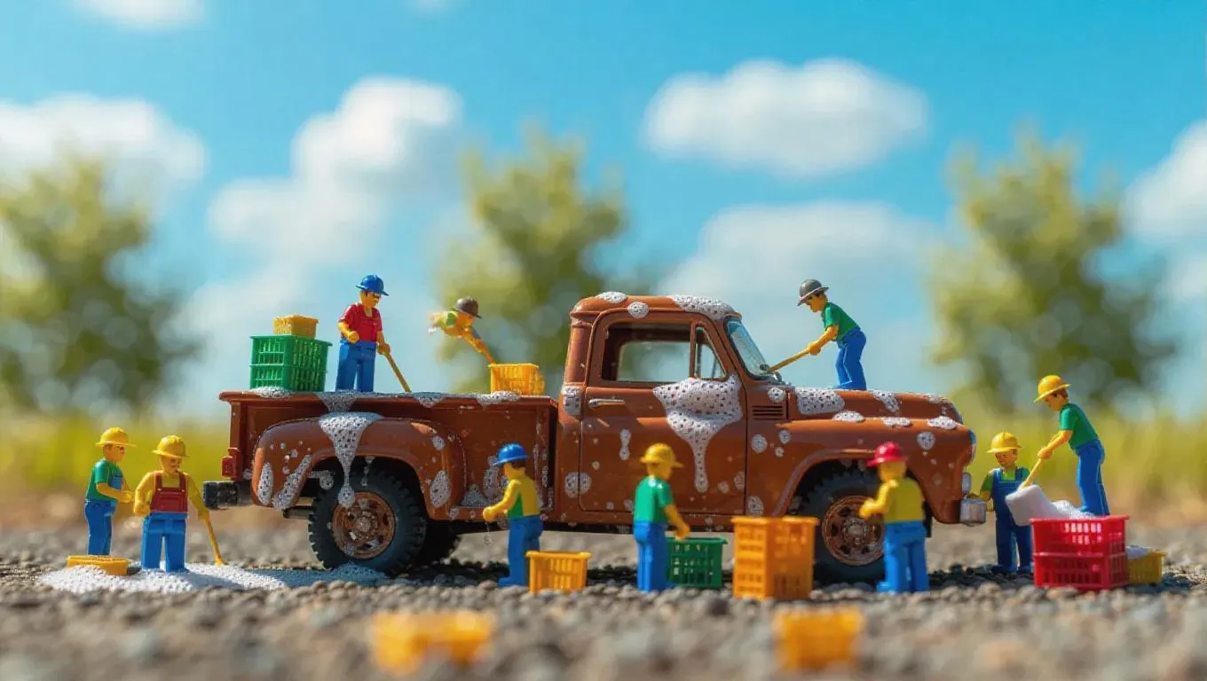 A group of tiny, thumb-sized workers is diligently cleaning a rustic brown pickup truck, which is the centerpiece of the image. The truck is parked on a gravel surface, possibly a farmyard or rural area, and has white splatters on its side, indicating that it has been recently washed or sprayed. The miniature workers are scattered around the truck, some standing closer to it while others are further away. They appear to be focused on their task, using tiny sponges and crates to scrub and rinse the vehicle. The surrounding environment is dominated by a bright, sunny sky, which casts a cheerful light over the scene. There are no other objects or people visible in the image, and no text or distinctive markings are present.