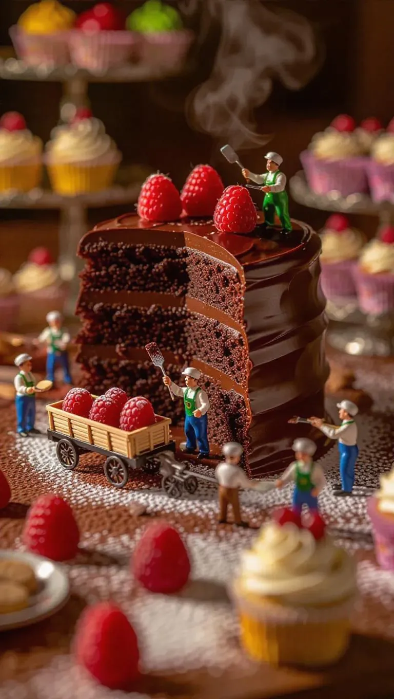 A whimsical culinary construction site where a giant chocolate cake is being assembled by pea-sized workers. A miniature cart carefully delivers a fresh layer of chocolate sponge, while tiny chefs spread ganache with small spatulas. Some workers roll raspberries into place like marbles, while others carefully sprinkle cocoa powder from tiny sacks. Steam rises gently, hinting at the warmth of freshly baked dessert, while the blurred background reveals a vibrant bakery setting with cupcakes and cookies nearby.