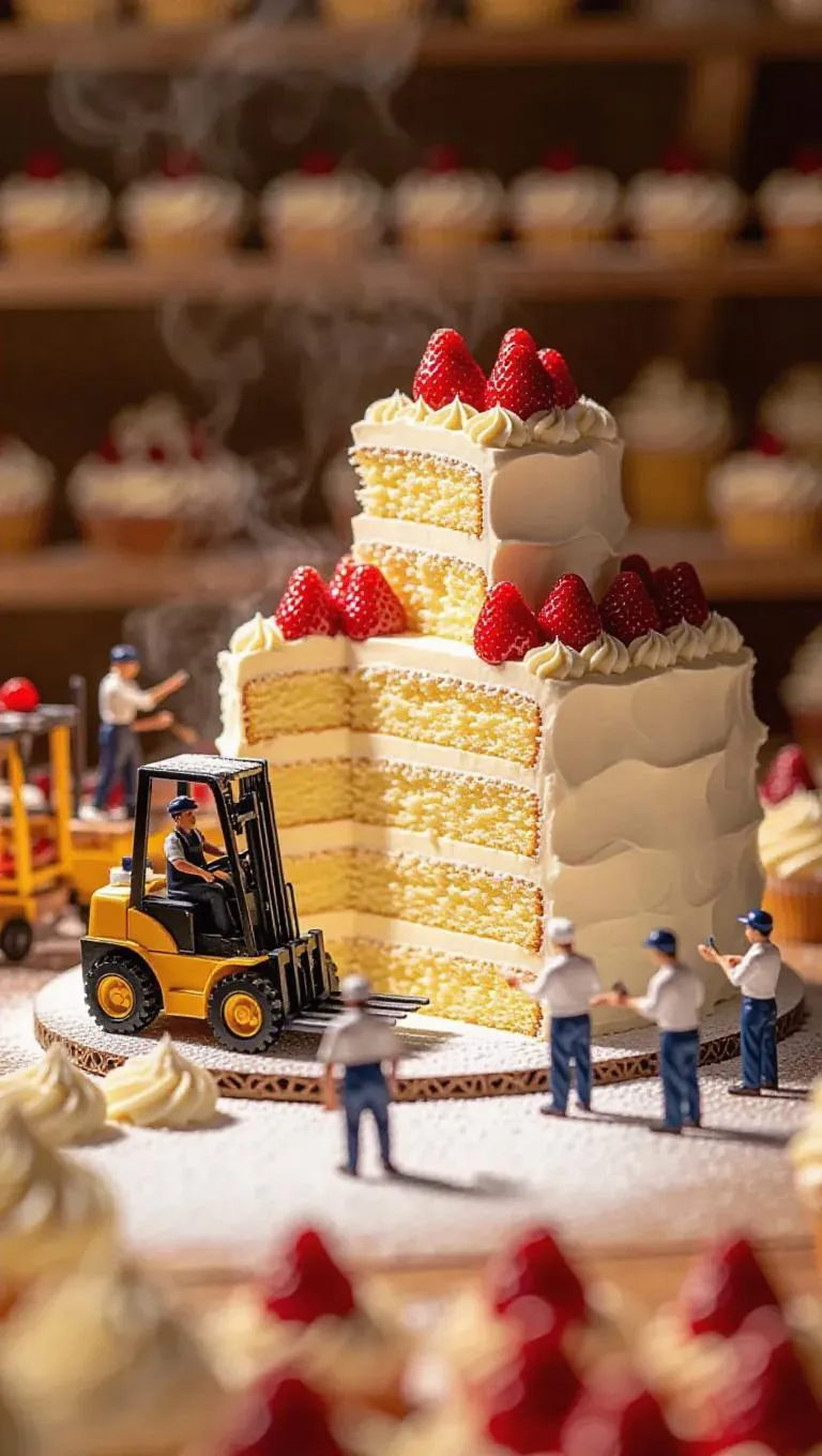 A vibrant culinary construction site where a colossal vanilla cake is being assembled by thumb-sized artisans. A miniature forklift carefully lifts a fresh layer of vanilla sponge cake, while tiny pastry chefs spread frosting with delicate palette knives. Some workers arrange strawberries into place like gems, while others meticulously sprinkle powdered sugar from tiny bags. Steam rises gently, hinting at the warmth of freshly baked delight, while the blurred background reveals a charming dessert shop filled with sweet treats.