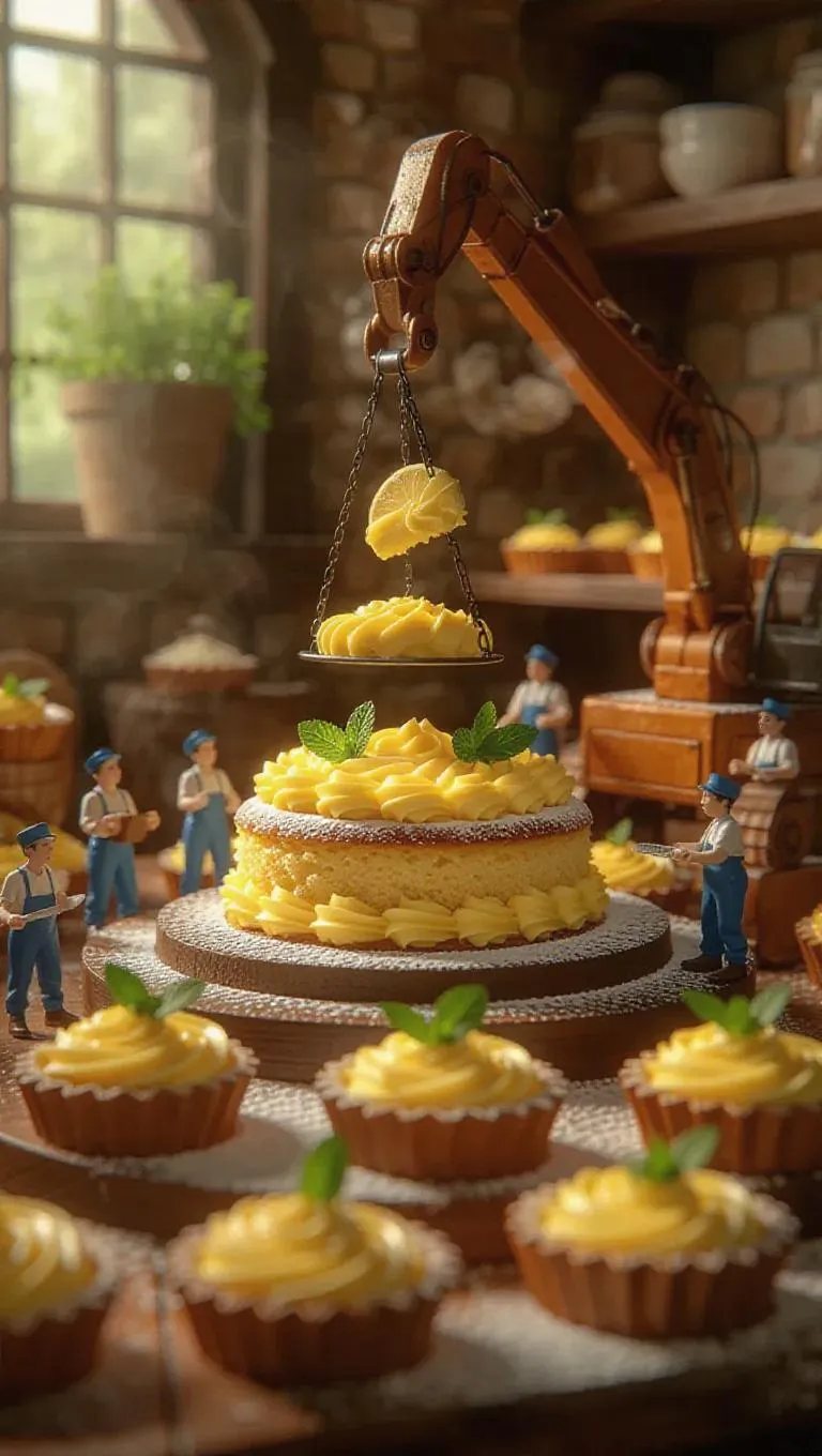 A magical culinary construction site where an enormous lemon cake is being assembled by thumb-sized bakers. A miniature crane gently lifts a fresh layer of lemon sponge, while tiny decorators spread lemon curd with small spatulas. Some workers arrange mint leaves into place like foliage, while others sprinkle zest from tiny bowls. Steam rises gently, hinting at the warmth of freshly baked pastries, while the blurred background portrays a lovely bistro with tarts and pastries on display.