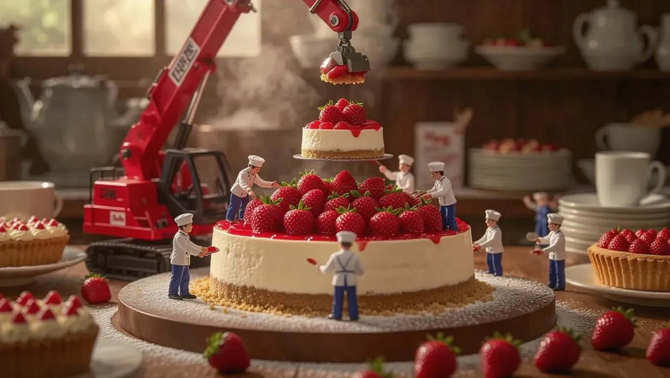 A whimsical culinary assembly area where a giant strawberry cheesecake is being constructed by tiny workers. A miniature crane carefully lifts a fresh layer of cheesecake, while small chefs spread strawberry glaze with little spatulas. Some workers roll graham cracker crumbs into place like a crust, while others sprinkle edible decorations from tiny bags. Steam rises gently, hinting at the warmth of freshly baked goodies, while the blurred background showcases a friendly café atmosphere with tarts and coffee.