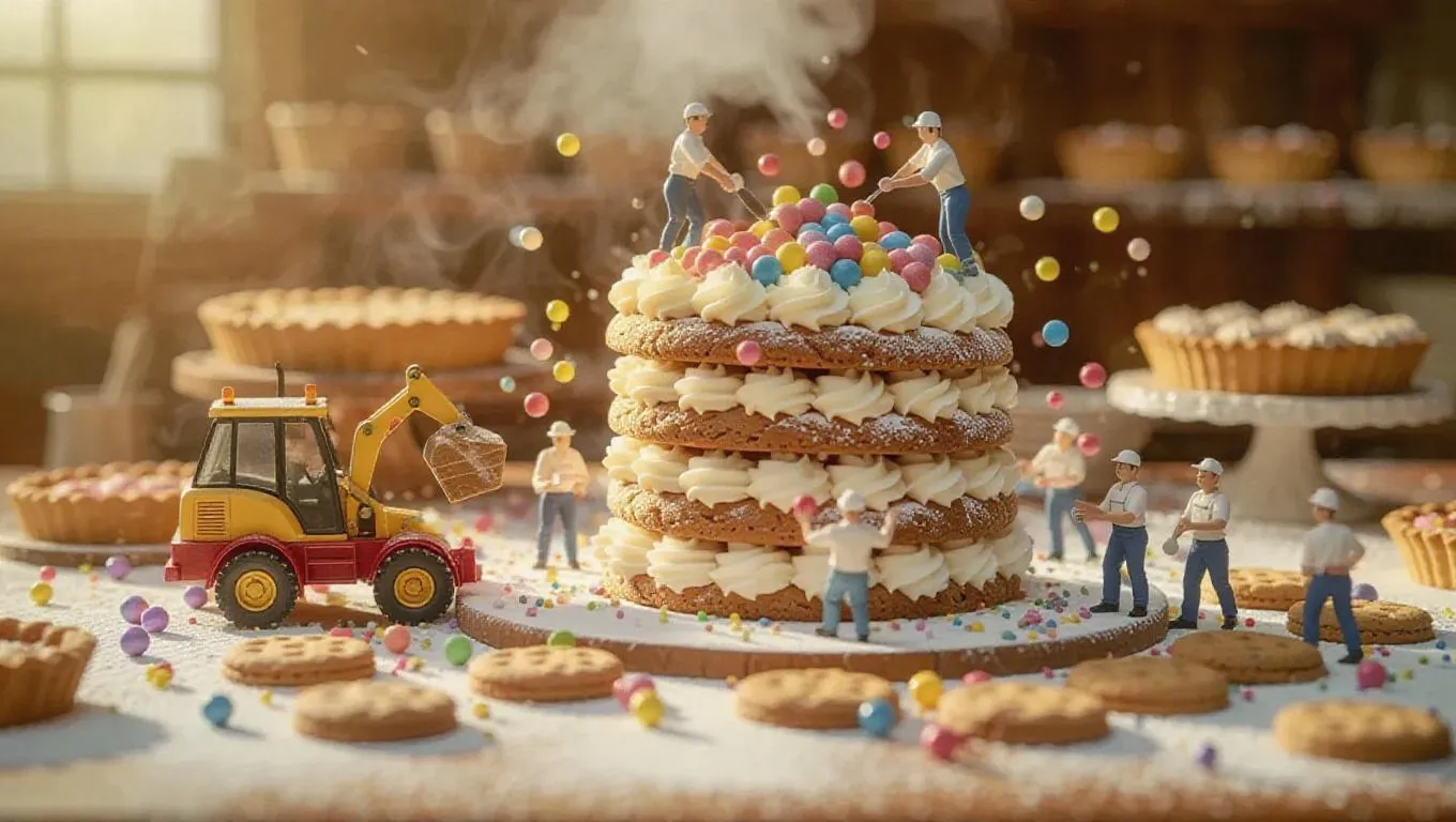 An artistic culinary construction site where a colossal cookie cake is being built by small professionals. A miniature machine carefully carries a fresh cookie layer, while tiny bakers spread icing with little tools. Some workers roll candy pieces into place like gems, while others sprinkle colored sugar from tiny containers. Steam rises gently, hinting at the warmth of freshly baked delights, while the blurred background displays a rustic bakery with pies and pastries.