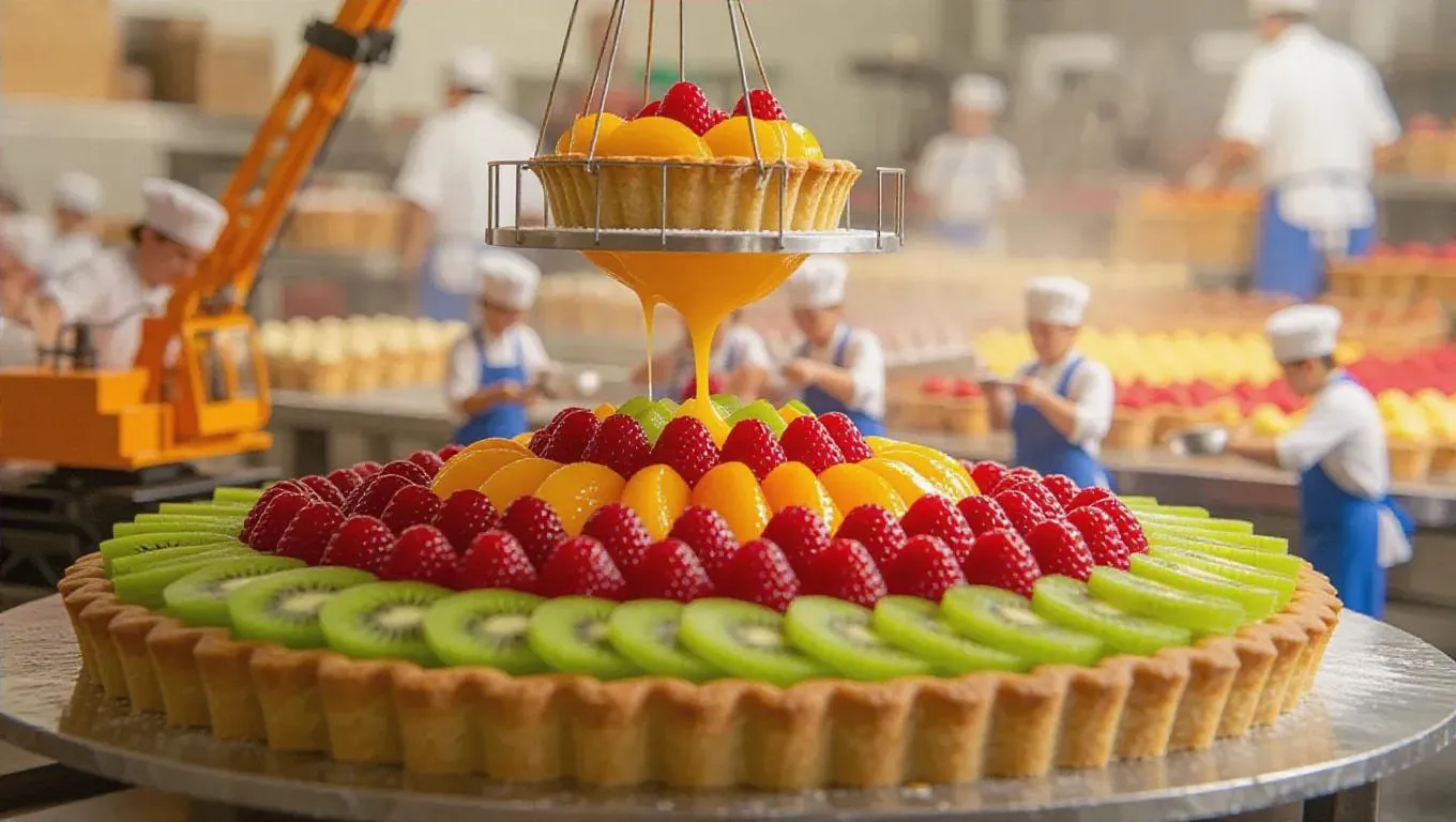 A creative culinary scene where a massive fruit tart is being assembled by tiny artisans. A miniature crane carefully lifts a fresh pastry base, while petite bakers layer fruit with small spatulas. Some workers arrange kiwi slices into place like tiles, while others drizzle glaze from tiny squeezers. Steam rises gently, hinting at the warmth of freshly prepared desserts, while the blurred background reveals a vibrant bakery filled with delicious options.