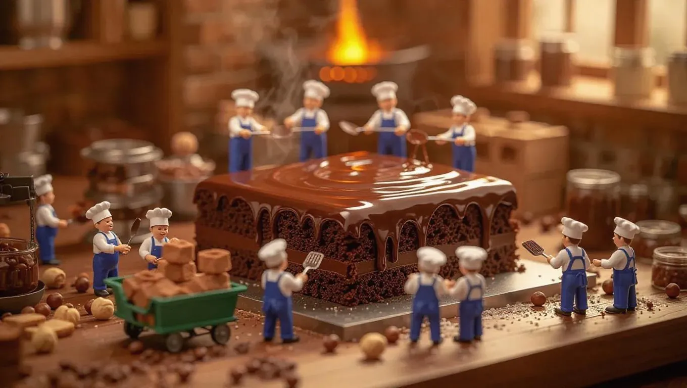 A cheerful culinary construction site where a gigantic fudge brownie is being built by miniature chefs. A small machine carefully transports a fresh brownie layer, while tiny bakers spread chocolate sauce with fun spatulas. Some workers roll hazelnuts into place like pebbles, while others sprinkle sea salt from tiny containers. Steam rises gently, hinting at the warmth of freshly baked treats, while the blurred background depicts a cozy café filled with sweet delights.