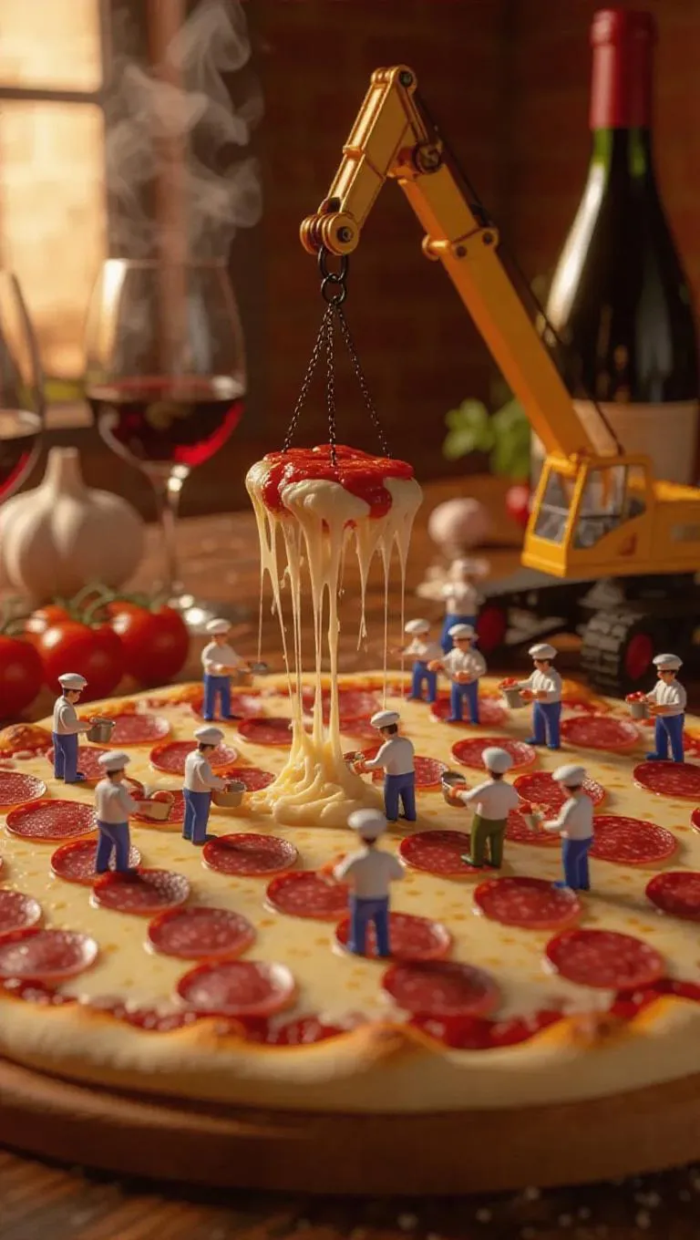 A playful culinary construction site where a massive pizza is being assembled by thumb-sized workers. A miniature crane carefully lifts a fresh layer of dough, while tiny chefs spread tomato sauce with small ladles. Some workers arrange pepperoni slices into place like tiles, while others carefully sprinkle cheese from tiny sacks. Steam rises gently, hinting at the warmth of freshly baked pizza, while the blurred background reveals a cozy Italian trattoria with wine and garlic bread nearby.