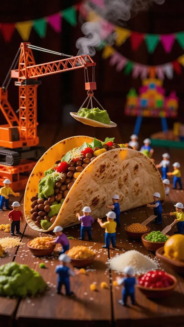 An enchanting culinary construction site where a gargantuan taco is being constructed by thumb-sized workers. A petite crane carefully lifts a fresh tortilla, while tiny cooks spread guacamole with small spatulas. Some workers arrange beans like puzzle pieces, while others finely sprinkle cheese from tiny sacks. Steam rises gently, hinting at the spicy flavors, while the blurred background reveals a vibrant fiesta scene with decorations and music nearby.