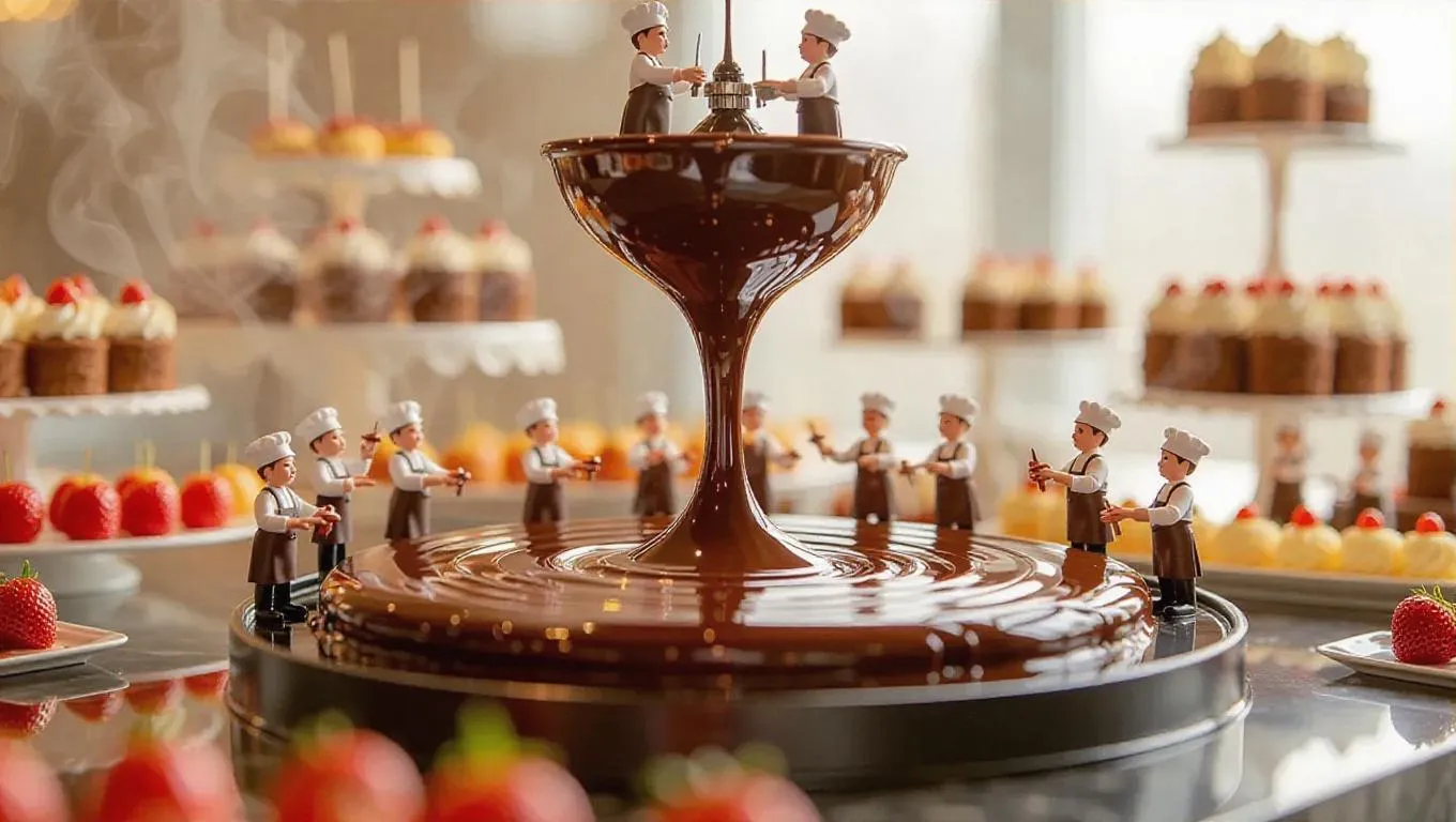 A magical culinary construction site where a giant chocolate fountain is being created by thumb-sized workers. A tiny pump carefully circulates melted chocolate, while miniature chefs prepare fruits with small knives. Some workers arrange skewers like masterpieces, while others sprinkle toppings from tiny containers. Steam rises gently, hinting at the richness of the dessert, while the blurred background reveals a elegant dessert bar with cakes and sweets nearby.