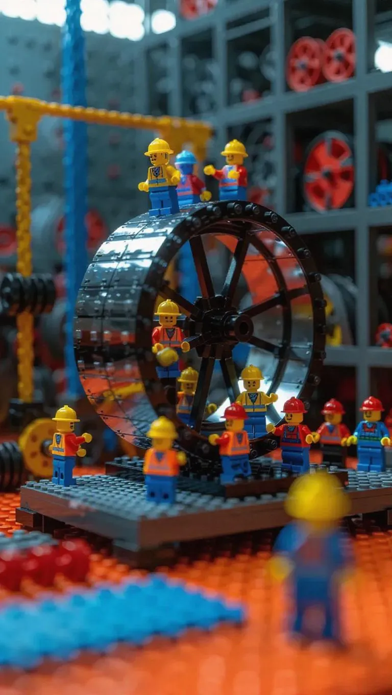 A team of miniature workers in bright helmets and aprons is inhabiting a giant hamster wheel. Some are running inside while others are monitoring gears on a tiny control panel, while energy emits like a power station. The scene resembles a playful gym, with weights and mats around.