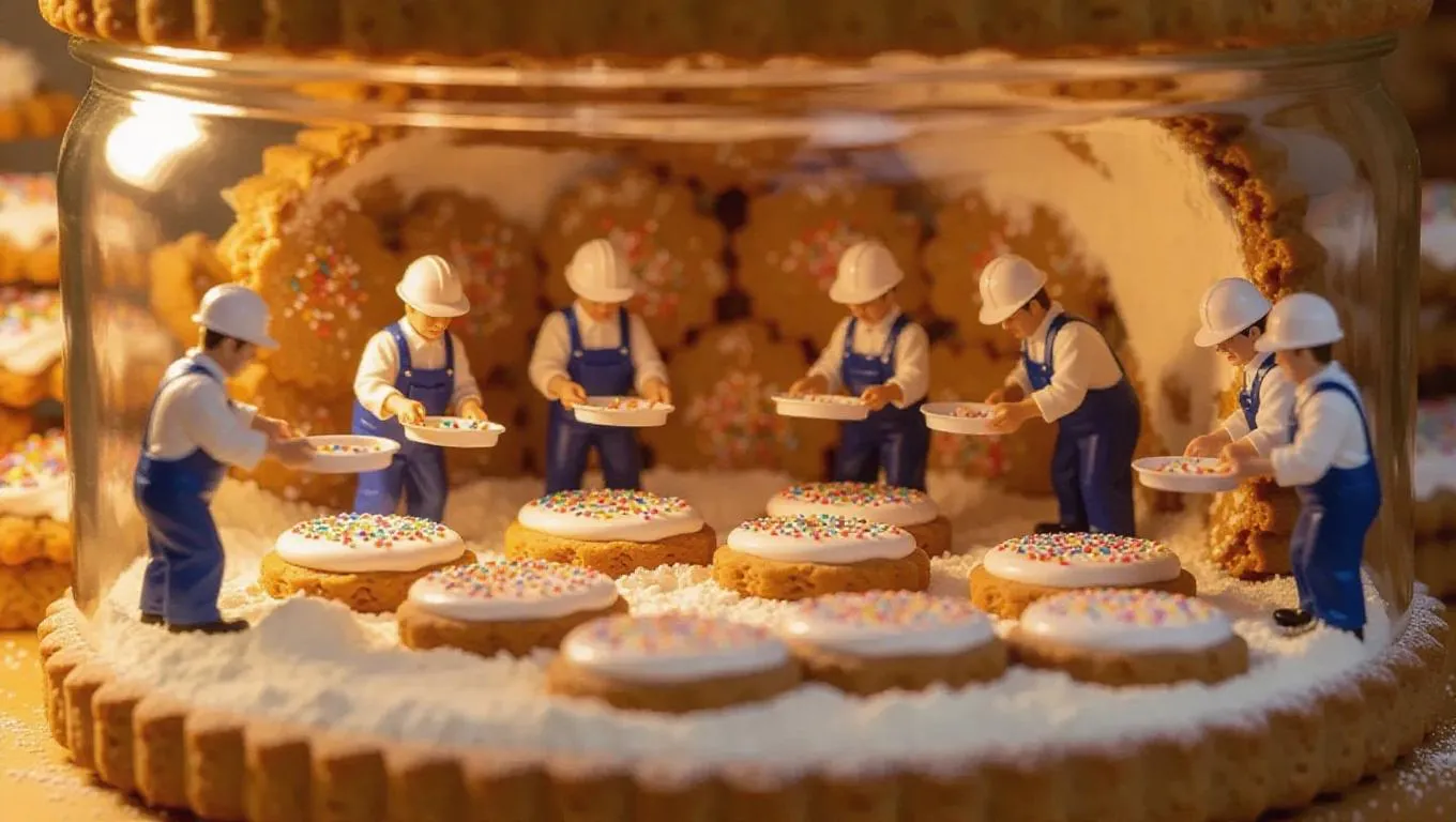 A team of miniature workers in shiny helmets and coveralls is operating within a giant cookie jar. Some are baking cookies with oversized trays, others are decorating them with icing on a miniature counter, while sweet aromas fill the air. The whole scene resembles a delightful bakery, with flour and sprinkles in sight.