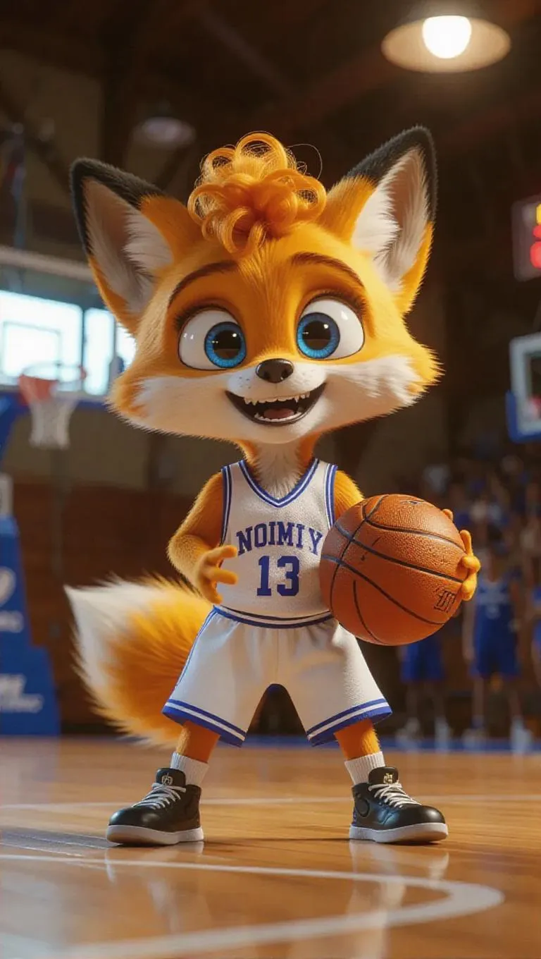 An anthropomorphic yellow fox with blue eyeballs, sporting a curly hairstyle and a basketball uniform, featuring white skin and an excited expression, captured in stunning 8K resolution, exuding charm and charisma. The scene is set in a basketball court, with the fox holding a basketball and preparing to shoot.
