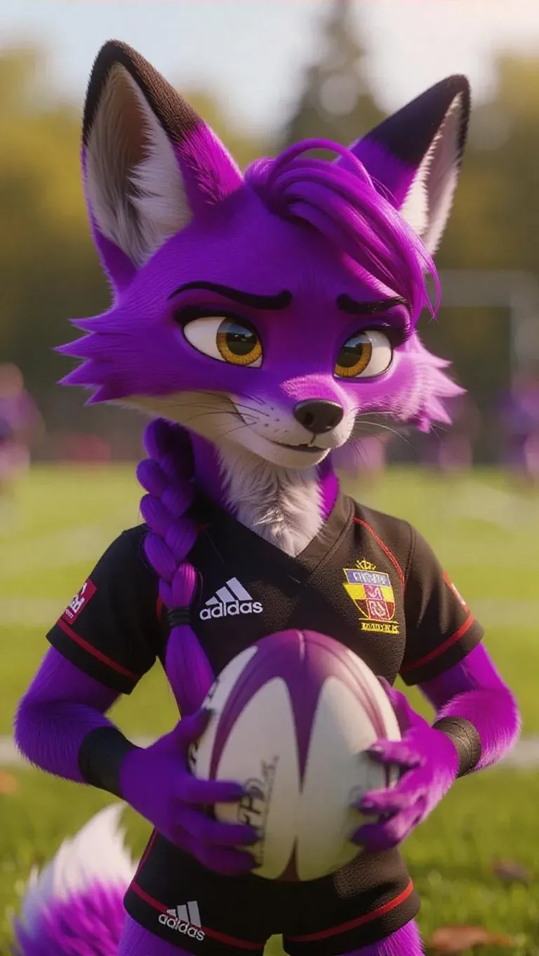 An anthropomorphic purple fox with yellow eyeballs, sporting a braided hairstyle and a rugby uniform, featuring pink skin and a determined expression, captured in stunning 8K resolution, exuding charm and charisma. The scene is set on a rugby pitch, with the fox holding a rugby ball and preparing to pass.