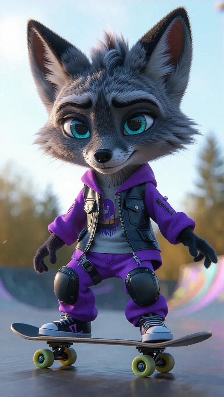 An anthropomorphic gray fox with turquoise eyeballs, sporting a side-part hairstyle and a skateboarding outfit, featuring lavender skin and a thrill-seeking expression, captured in stunning 8K resolution, exuding charm and charisma. The scene is set in a skatepark, with the fox holding a skateboard and preparing to perform a trick.