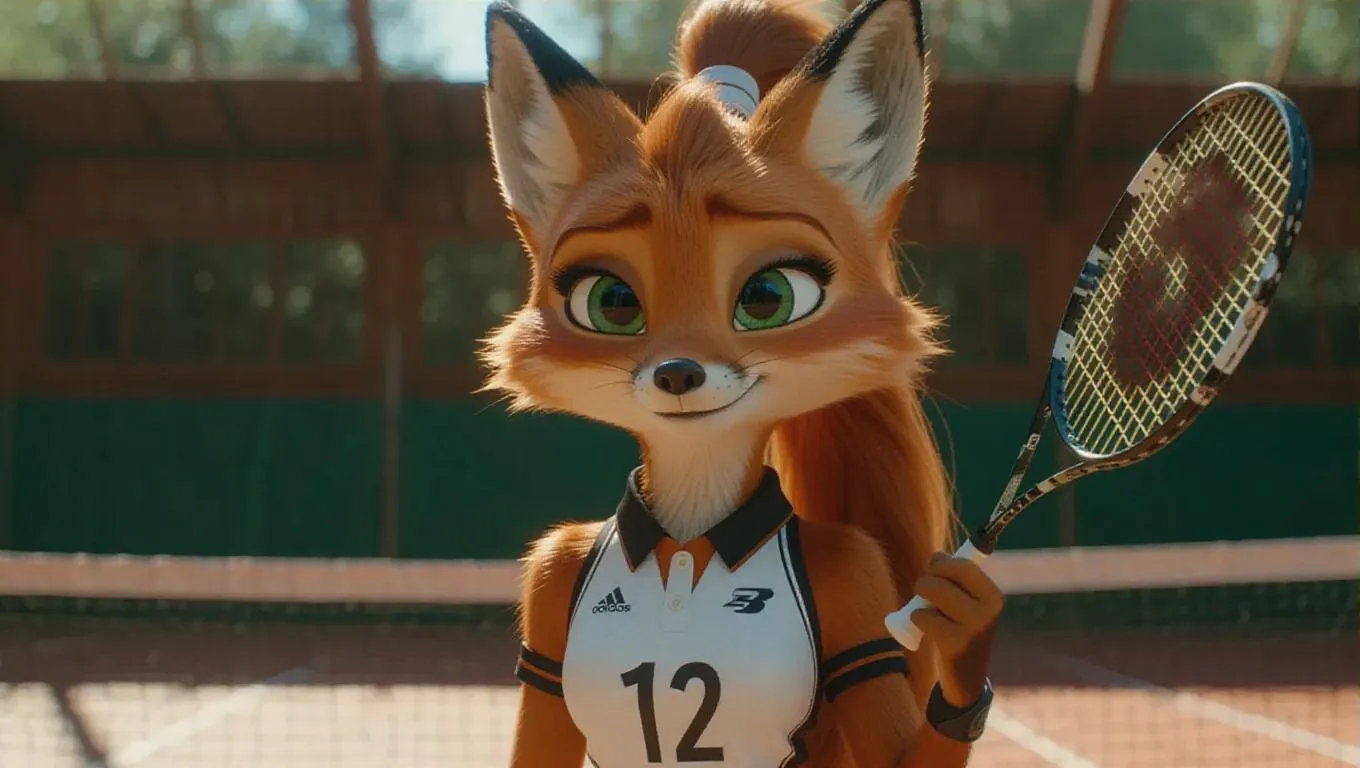 An anthropomorphic chestnut fox with opal eyeballs, sporting a sleek ponytail and a badminton uniform, featuring ash-colored skin and a playful expression, captured in stunning 8K resolution, exuding charm and charisma. The scene is set on a badminton court, with the fox holding a racket and preparing to serve.