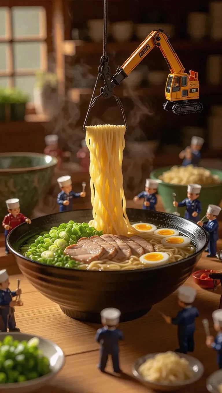 A playful culinary construction site where a massive bowl of ramen is being assembled by thumb-sized workers. A miniature crane carefully lifts a fresh noodle bundle, while tiny chefs arrange slices of pork and soft-boiled eggs with small tweezers. Some workers place scallions and nori into place like garnishes, while others carefully pour broth from tiny pitchers. Steam rises gently, hinting at the warmth of the hearty soup, while the blurred background reveals a cozy ramen shop with green tea and gyoza nearby.