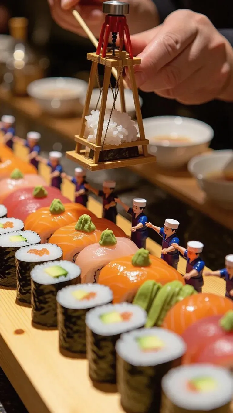 A bustling sushi restaurant where a massive sushi roll is being crafted by thumb-sized chefs. A miniature crane carefully lifts a sheet of nori, while tiny chefs arrange slices of fish and avocado with small tweezers. Some workers place wasabi and ginger into place like garnishes, while others carefully pour soy sauce from tiny pitchers. Rice grains spill gently, hinting at the freshness of the dish, while the blurred background reveals a cozy sushi bar with miso soup and sake nearby.