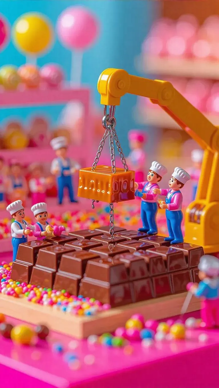 A colorful candy factory where a giant chocolate bar is being assembled by thumb-sized workers. A miniature crane carefully lifts a mold of caramel, while tiny chefs arrange nuts and fruit slices with small tweezers. Some workers place sprinkles and wrappers into place like garnishes, while others carefully pour melted chocolate from tiny pitchers. Sweet aromas waft gently, hinting at the richness of the treats, while the blurred background reveals a cozy store with lollipops and gummies nearby.