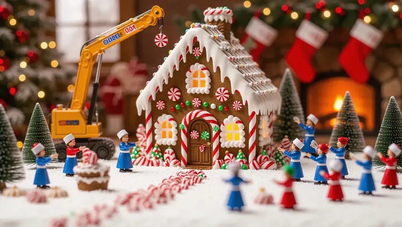 A festive holiday kitchen where a massive gingerbread house is being decorated by thumb-sized bakers. A miniature crane carefully lifts a candy cane, while tiny chefs arrange gumdrops and icing with small tweezers. Some workers place peppermint and chocolate into place like decorations, while others carefully pour syrup from tiny pitchers. Spices fill the air, hinting at the warmth of the season, while the blurred background reveals a cozy fireplace with stockings and lights nearby.