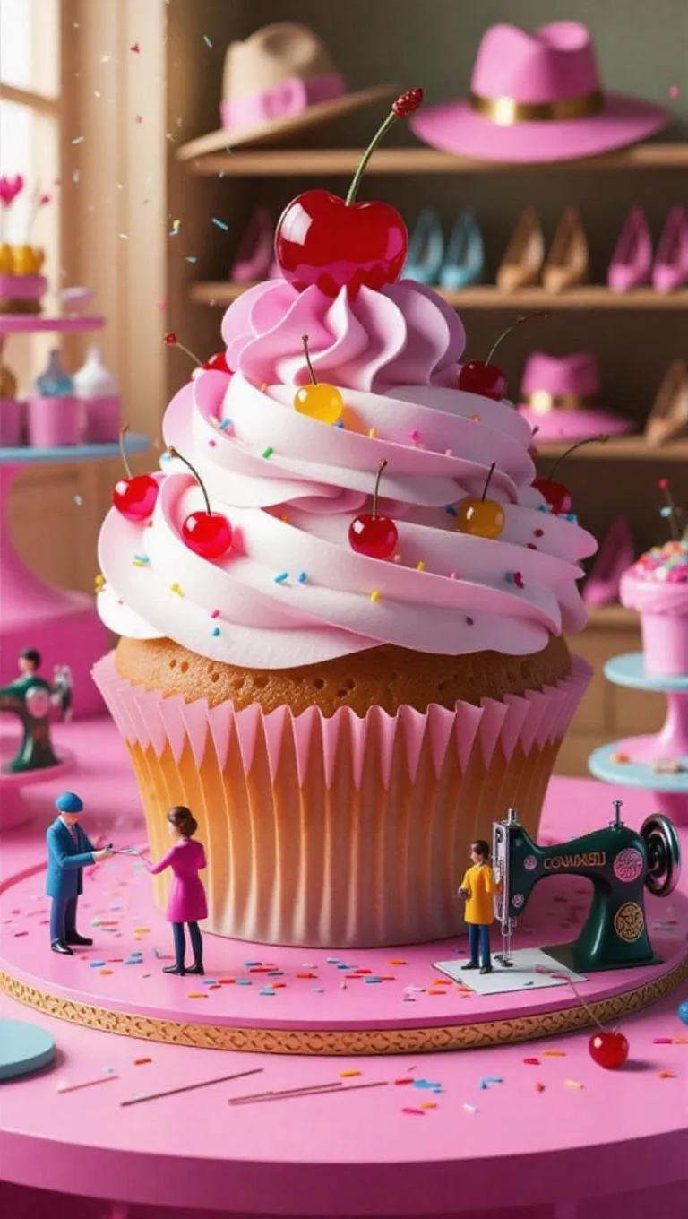 A whimsical fashion studio where a gigantic cupcake is being designed by thumb-sized tailors. A tiny sewing machine stitches together colorful frosting layers, while little designers carefully place sprinkles with tiny tweezers. Some workers arrange cherries on top like accessories, while others drizzle caramel sauce from miniature bottles. Threads of glitter float in the air, hinting at the glamour of a haute couture dessert, while the softly blurred background features a trendy boutique with stylish hats and shoes.