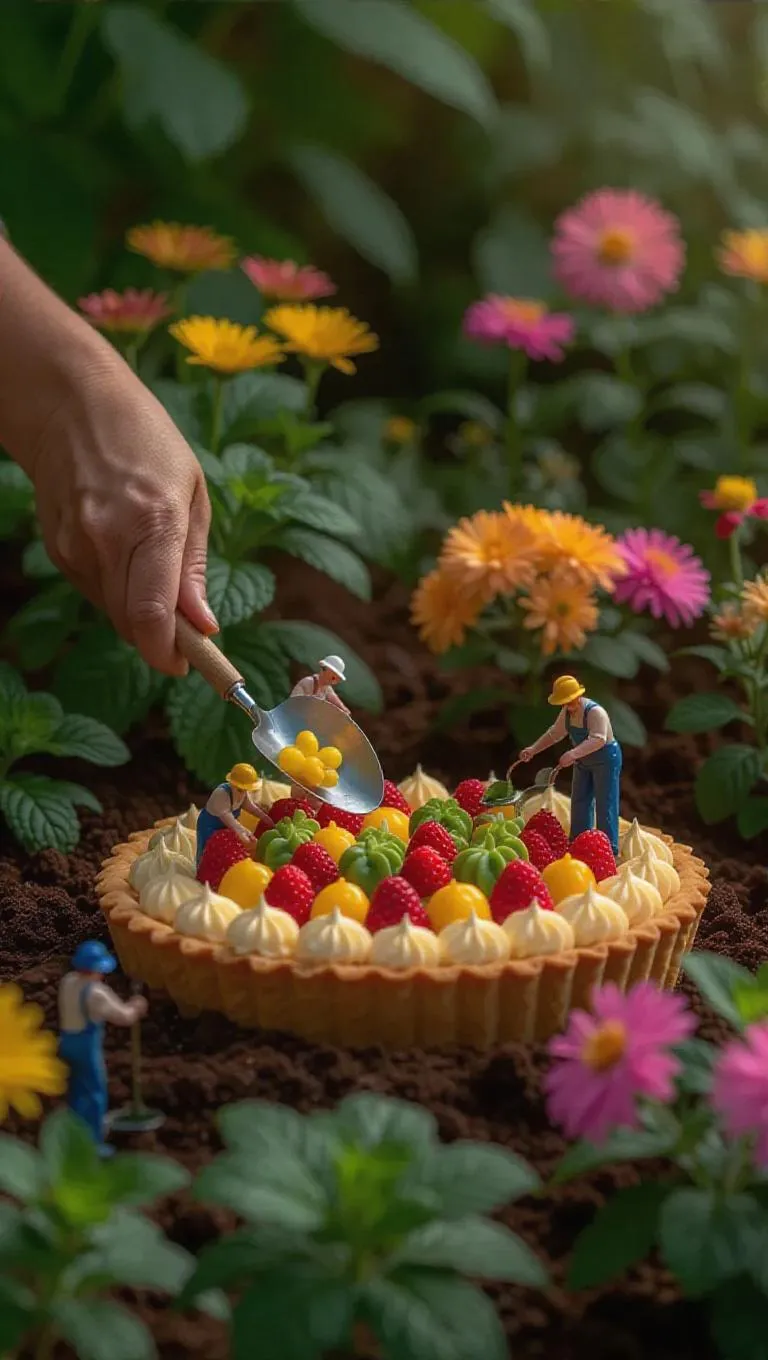 A serene botanical garden where a gigantic fruit tart is being arranged by thumb-sized gardeners. A petite trowel digs into the soil, while little horticulturists place flower-shaped fruits delicately. Some workers sprinkle edible flowers, while others layer custard from tiny bowls. The fragrance of fresh blooms fills the air, while the background showcases lush greenery and vibrant flowers in soft focus.