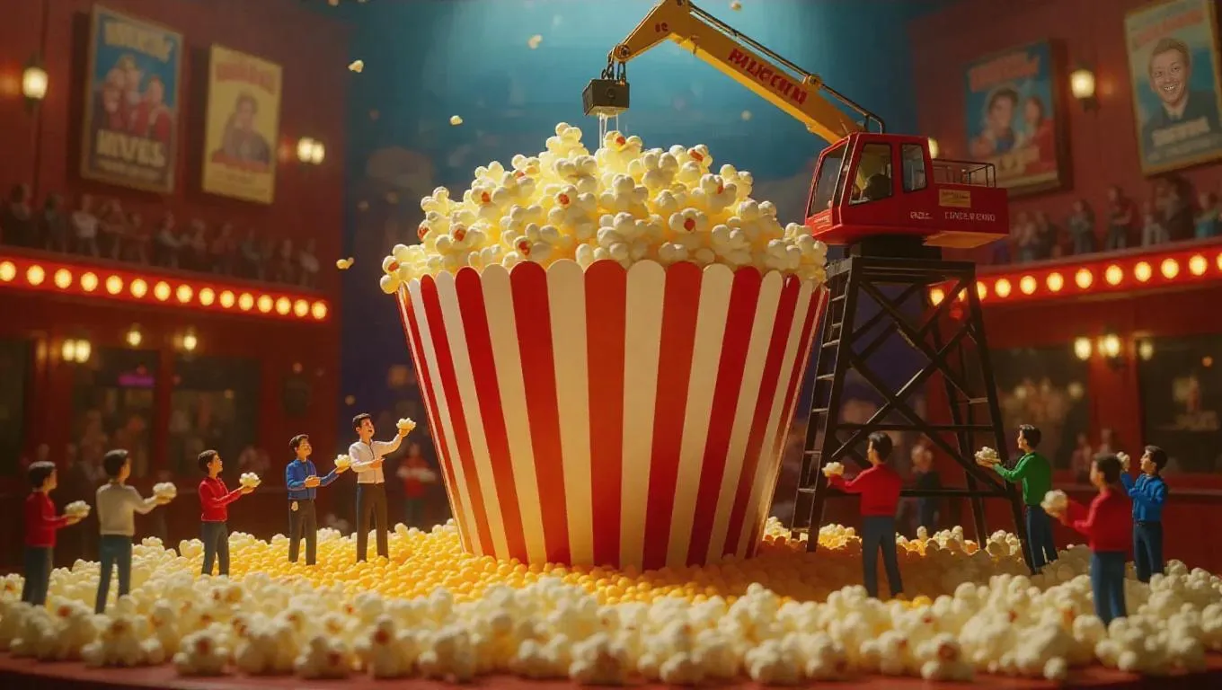 A playful movie set where a huge popcorn sculpture is being crafted by thumb-sized filmmakers. A mini crane lifts fluffy popcorn pieces, while small directors oversee the placement meticulously. Some workers drizzle butter from tiny pitchers, while others arrange candy corn around the base. The scent of buttery popcorn fills the air, while the background reveals a bustling cinema with posters and happy moviegoers.
