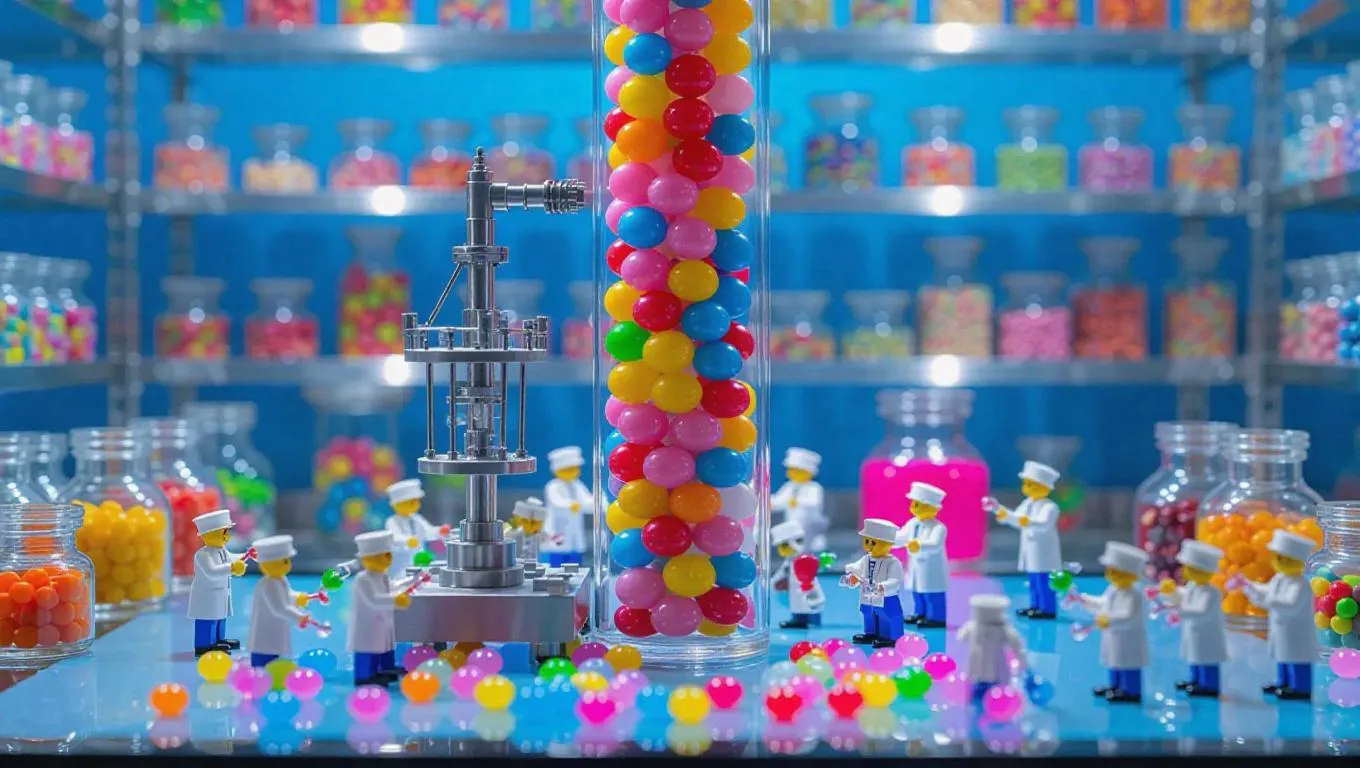 An imaginative laboratory where an enormous jellybean tower is being constructed by thumb-sized scientists. A miniature rig transports colorful jellybeans with precision, while tiny researchers examine flavors with small tools. Some workers create edible experiments with popping candy, while others drizzle syrup from minuscule flasks. The sweet scent of sugar lingers in the air, while the softly blurred background displays shelves of quirky candy jars and gadgets.