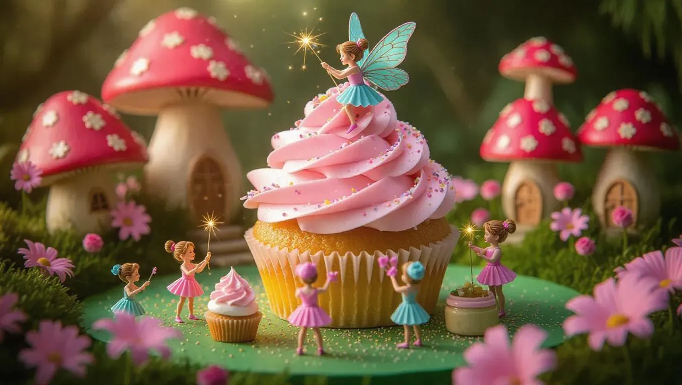 A magical fairy garden where a giant flower cupcake is being crafted by thumb-sized fairies. A small wand sprinkles edible glitter, while tiny bakers shape frosting petals with care. Some workers arrange sugar roses, while others drizzle honey from tiny jars. The sweet perfumed air is filled with enchantment, while the background shows whimsical mushrooms and fairy houses nestled among blossoms.