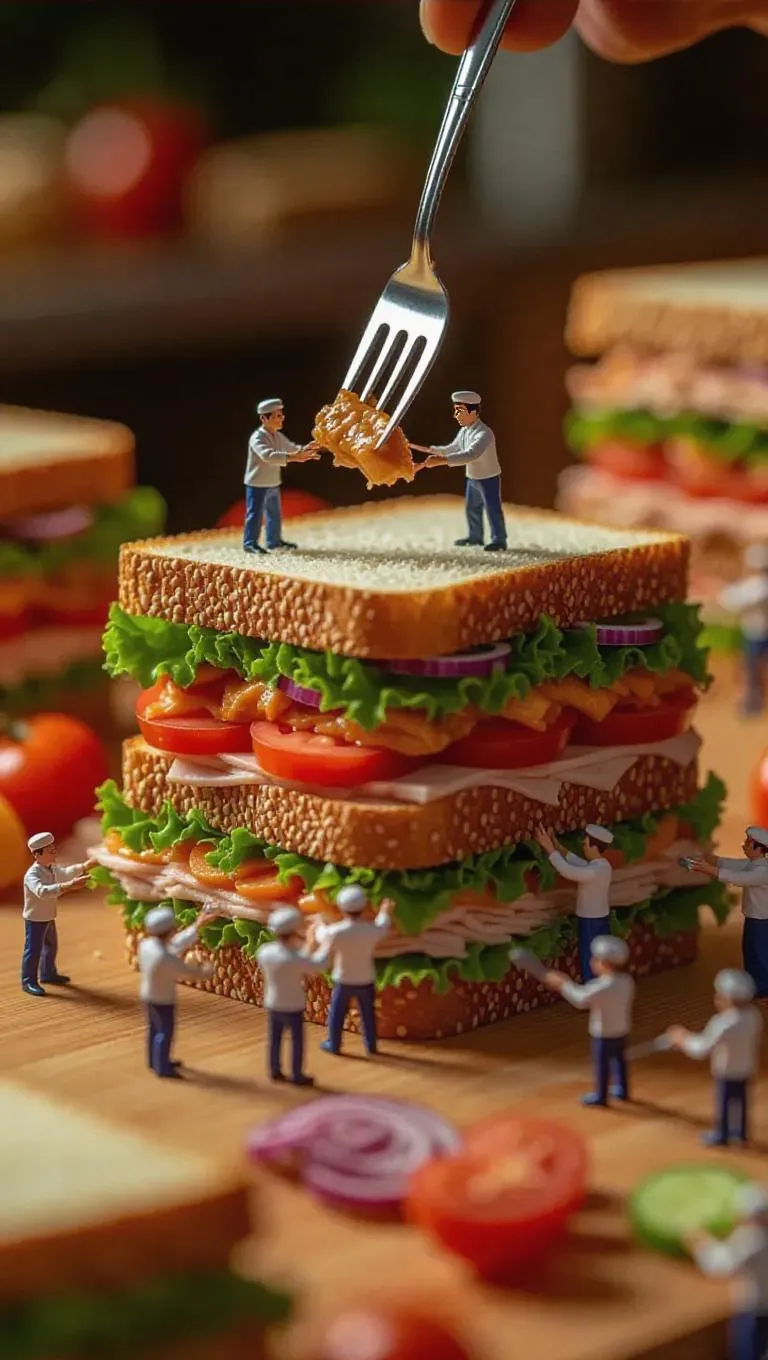 A vibrant construction zone for a colossal sandwich being assembled by tiny workers. A miniature fork lifts a fresh slice of bread, while small chefs layer it with lettuce, tomatoes, and turkey using little hands. Some workers press the sandwich together tightly, while others wrap it up with paper. Flavorful aromas waft around, with the background depicting a lively deli filled with sandwiches and salads.