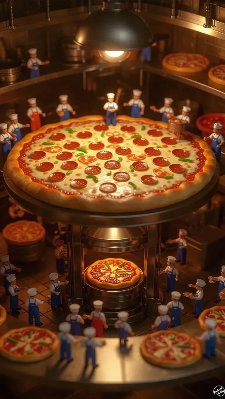 A cartoonish pizza factory where a massive pizza is being topped by miniature workers. A tiny lift hauls a big disk of dough, while small chefs spread tomato sauce and sprinkle cheese using small ladles. Some workers add toppings like pepperoni and bell peppers, while others bake them in a mini oven. The cheesy aroma wafts through, revealing a bustling pizzeria with customers enjoying their meals in the background.