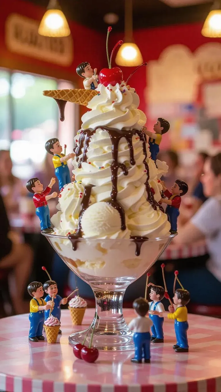 A quirky ice cream parlor where a massive sundae is being created by tiny servers. A tiny elevator lifts a scoop of ice cream, while small chefs drizzle chocolate sauce and whipped cream using miniature squeezers. Some workers add cherries and sprinkles, while others prepare waffle cones. A sweet, creamy aroma fills the space, with the blurred background showing families enjoying ice cream at their tables.